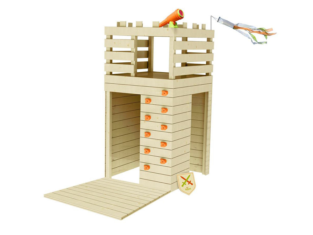 Une longue-vue, un mur d'escalade et un bouclier en bois sur le thème des chevaliers complètent la maison de jeu. Les enfants peuvent se déplacer comme de vrais chevaliers et utiliser leur imagination pour vivre des aventures passionnantes.