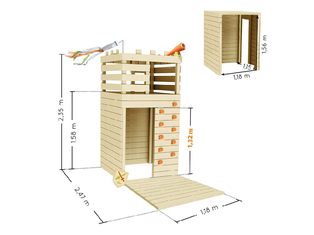La terrasse est accessible via une échelle solide et dispose d'une clôture pour plus de sécurité. Avec une hauteur de 158 cm, les enfants peuvent profiter d'une vue imprenable depuis la terrasse. La maison de jeu n'a pas de portes, mais de larges ouvertures, ce qui permet aux enfants d'entrer et de sortir facilement.