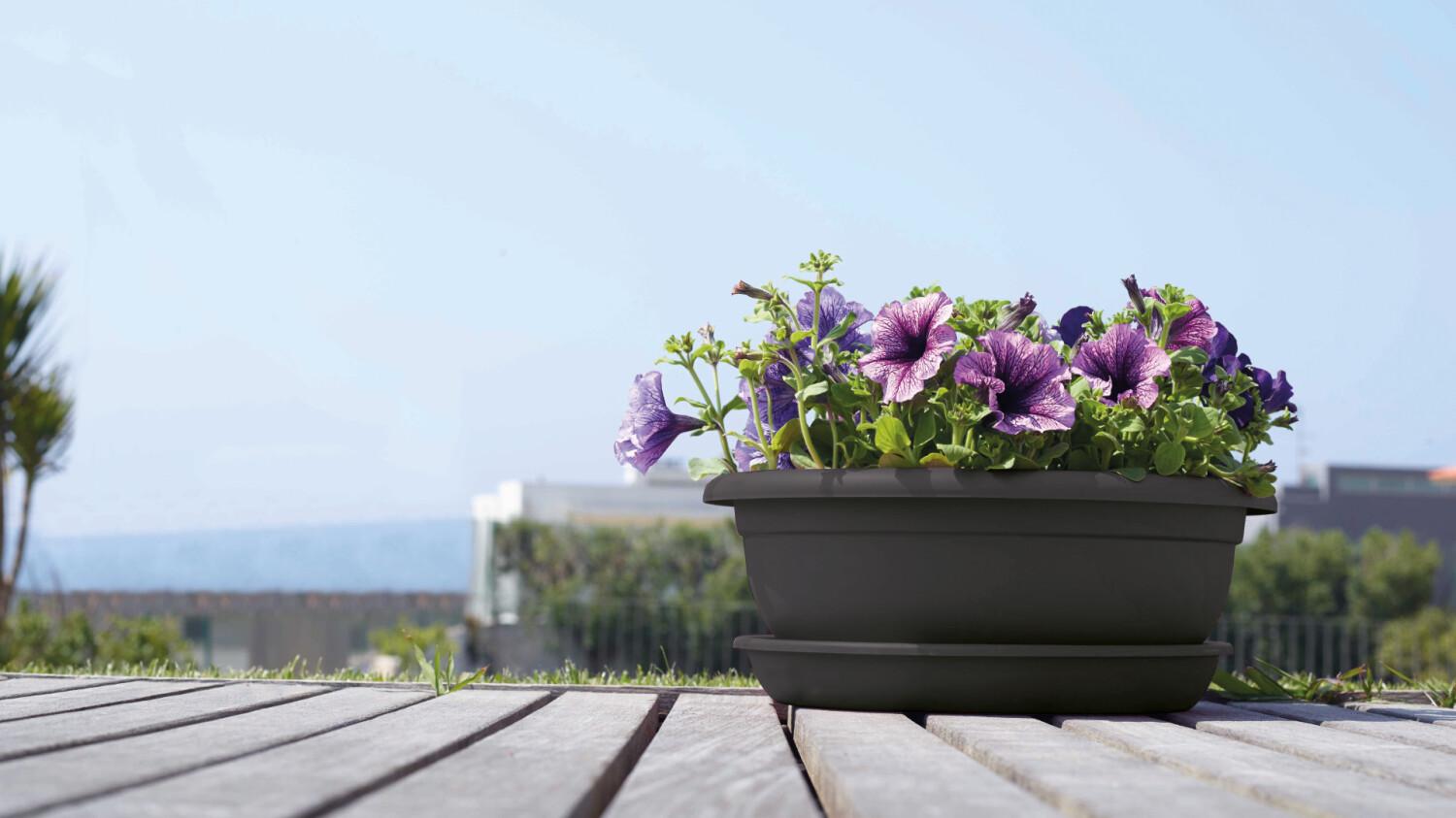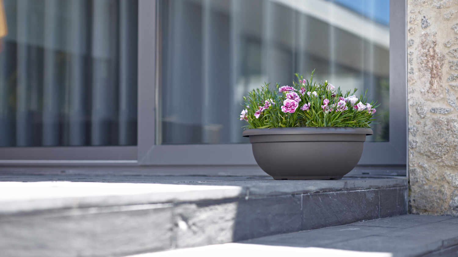 Bol de fleurs Venezia en anthracite de la marque Artevasi. Ce pot de fleurs rond est fabriqué dans un plastique résistant aux UV, il peut donc être utilisé aussi bien à l'intérieur qu'à l'extérieur.
