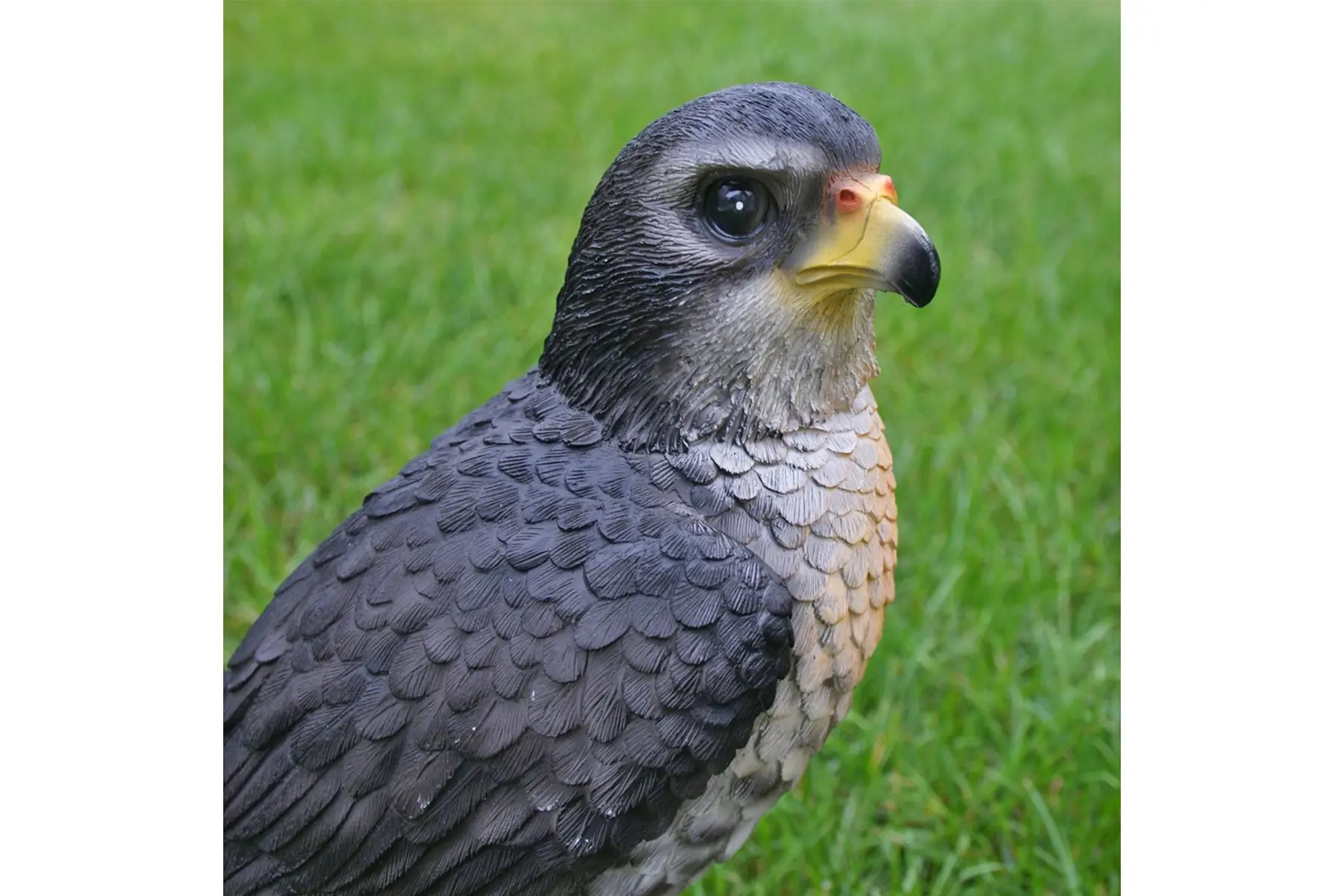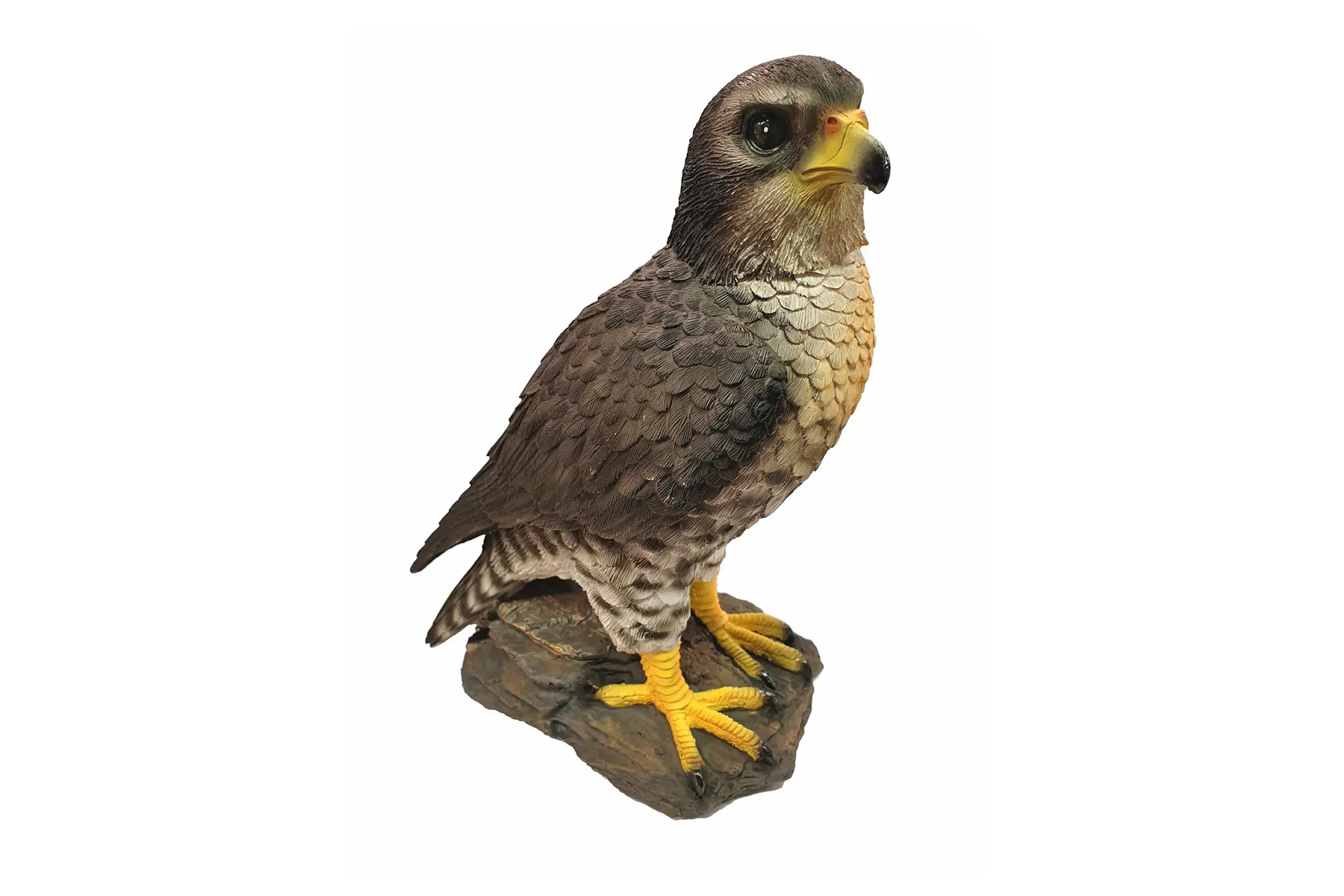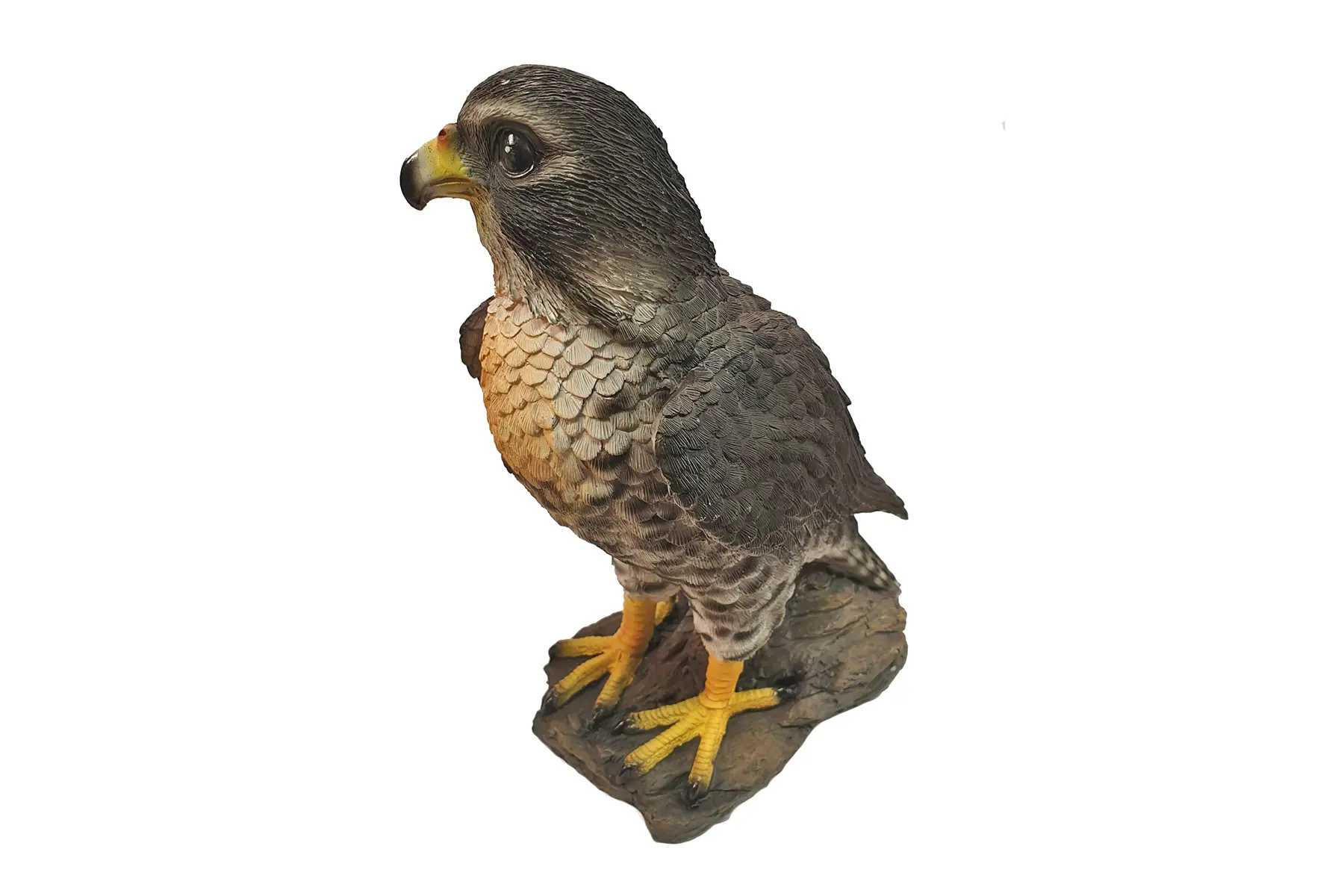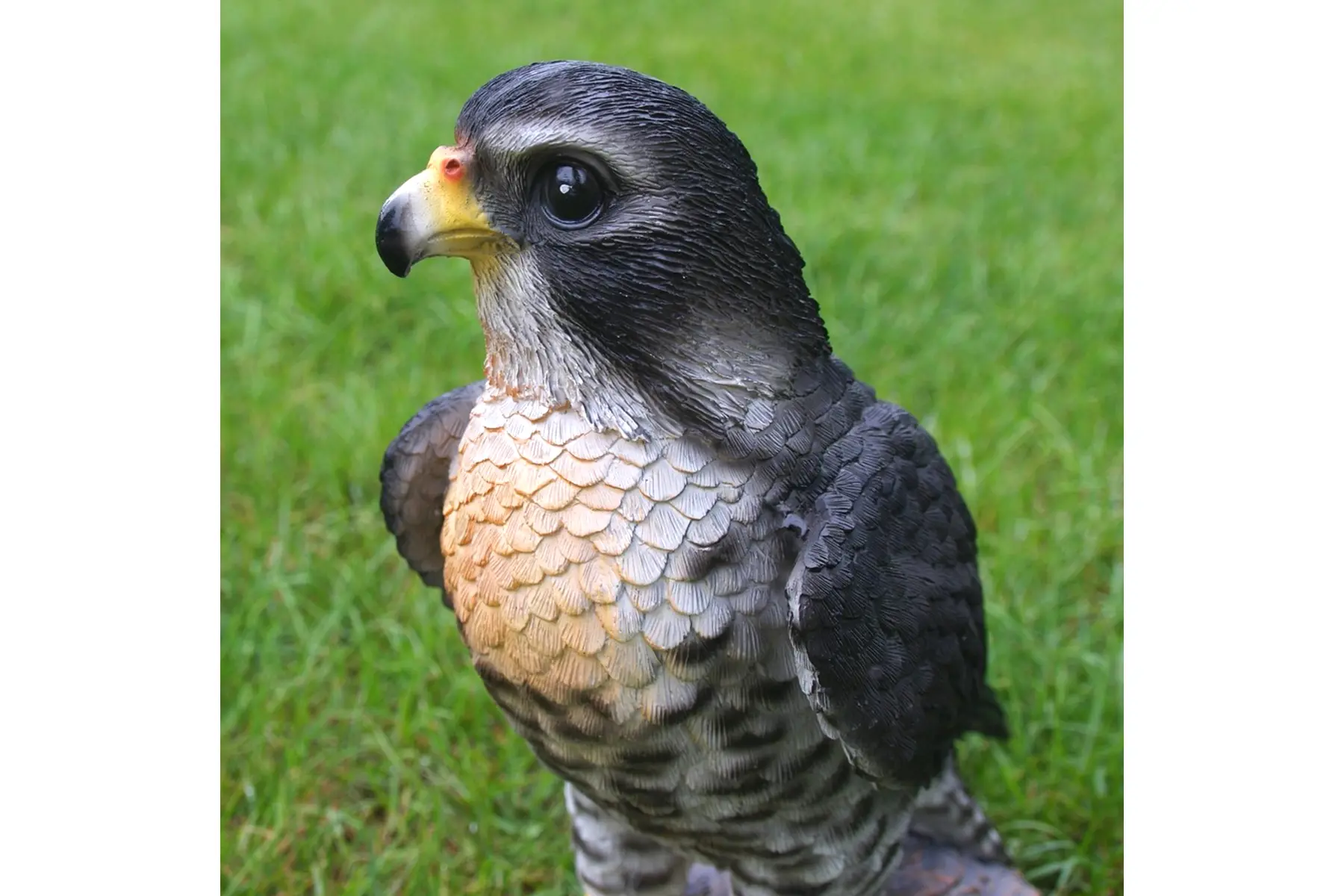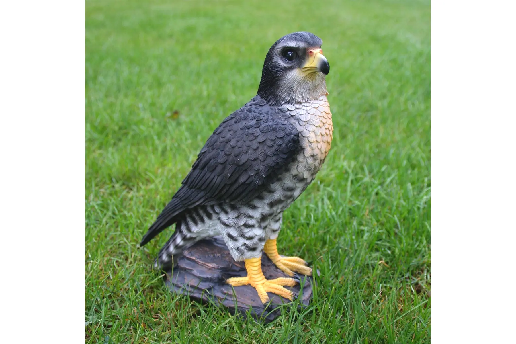 Cette sculpture d'un faucon au repos sur un tronc d'arbre semble observer les environs. Sur cette sculpture, tous les détails ont été parfaitement représentés. C'est comme si l'on avait un faucon réel. La sculpture est réalisée en polyrésine, une résine durable qui se montre résistante à bien des conditions climatiques.