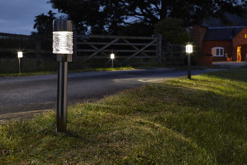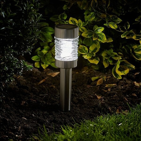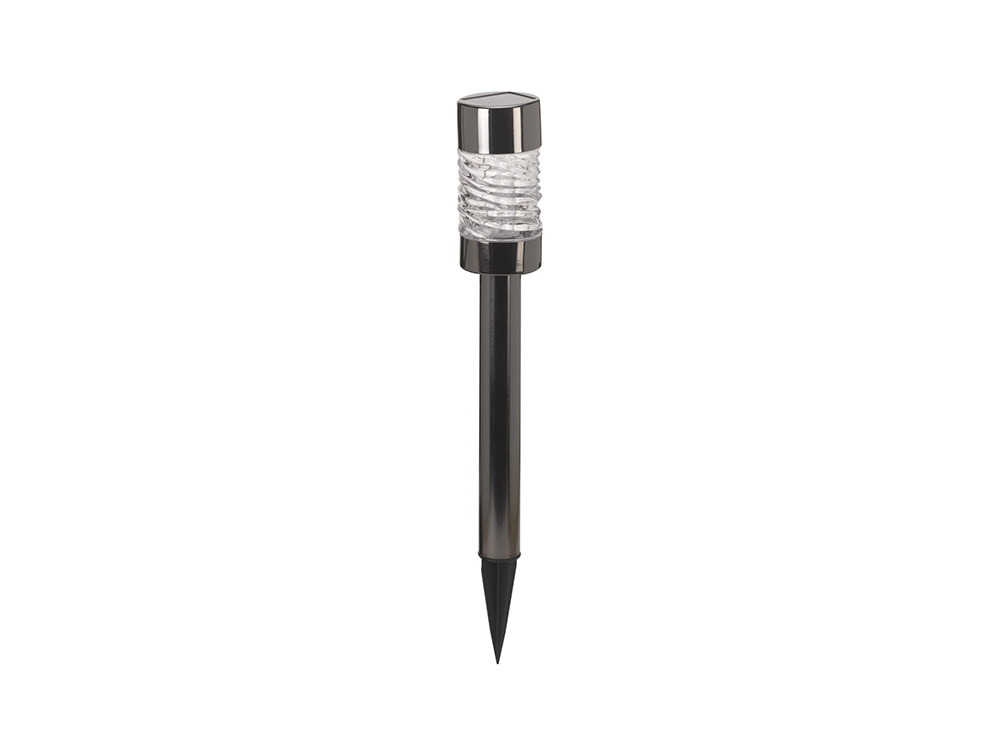 Ceci est une lampe solaire d'une puissance de 5 lumen sur piquet de sol avec un verre solide. Une construction réalisée en acier inoxydable brossé et dotée d'une lentille pour une diffusion maximale de la lumière.