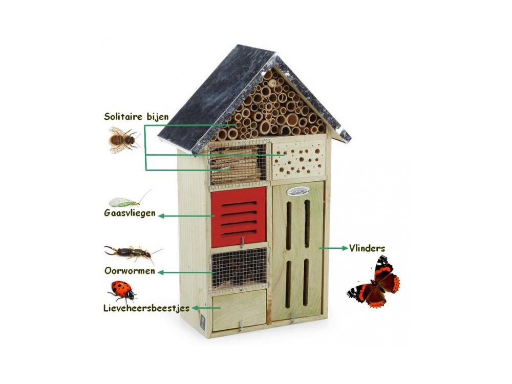 Le compartiment rouge offre l'accueil aux chrysopes vertes, aux coccinelles et dermaptères. Ce sont tous de chasseurs du vermin. ; ils mangent des pucerons et des mites. La couleur rouge de la porte va plus spécialement attirer les chrysopes. Remplissez le compartiment avec de la paille pour que les insectes puissent venir dès septembre et jusqu'au début d'avril pour passer l'hiver.