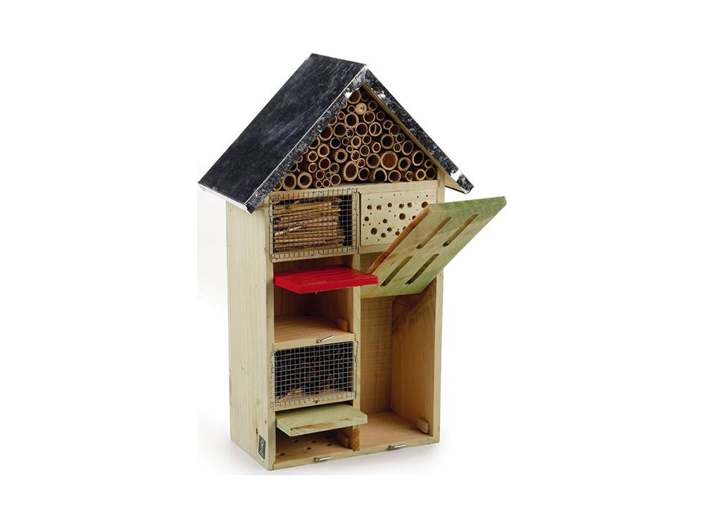 Les insectes remplissent beaucoup de tâches dans nos jardins. Ce sont des prédateurs naturels pour la vermine et ils pollinisent beaucoup de fleurs. Avec cet hôtel pour insectes d'Esschert Design vous pouvez offrir à différentes sortes d'insectes la chance de construire un nid et d'avoir une protection en hiver. L'habitat naturel de nombreuses variétés d'insectes est menacé par les changements dans leur environnement et c'est le moyen de les aider.
