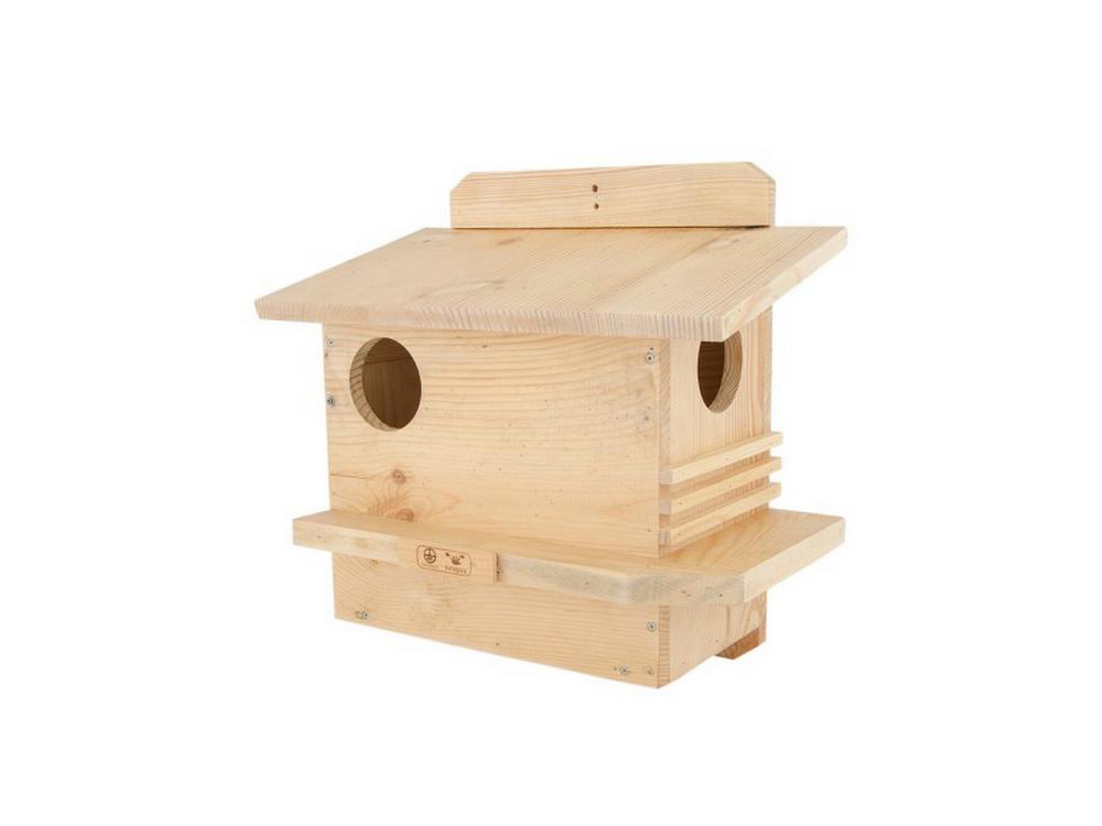 L'abri écureuil a sur son côté une petite porte qui peut être ouverte pour le nettoyer. Sur le devant et le côté, une petite planche est prévue pour permettre à l'écureuil de se reposer.