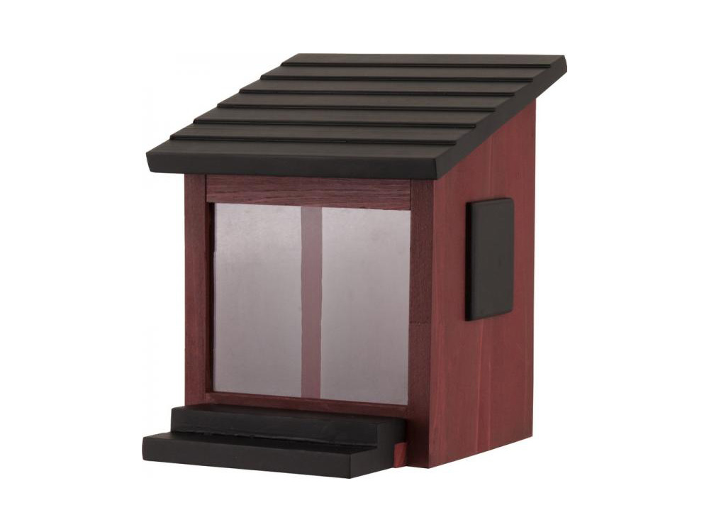 L’Ekorrmatare est rempli de noix ou de nourriture spéciale pour écureuils, visiblement stockée derrière de grandes fenêtres à l’avant. L’écureuil s’assoit sur la véranda en bois saillante et utilise sa tête pour soulever le toit et atteindre la nourriture. La maison de mangeoire pour écureuils est en bois massif résistant aux intempéries et équipée d’un bloc suspendu pour être fixé contre un mur ou un arbre.