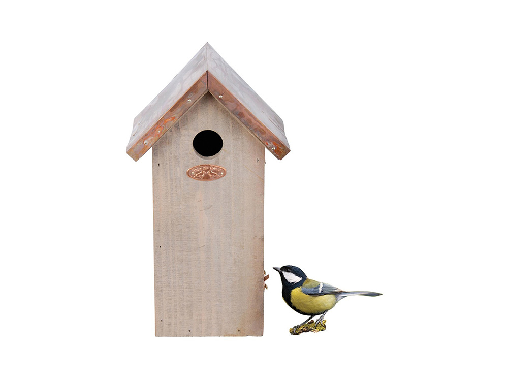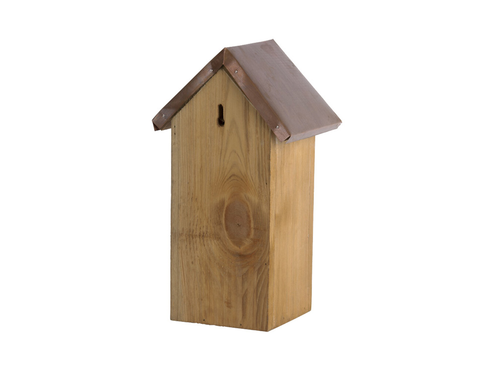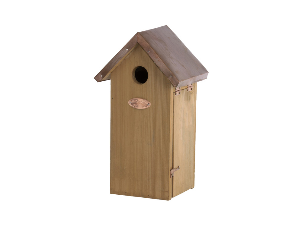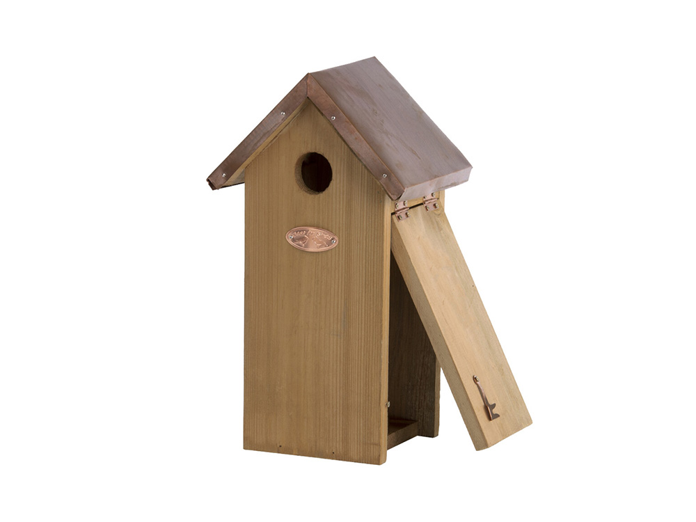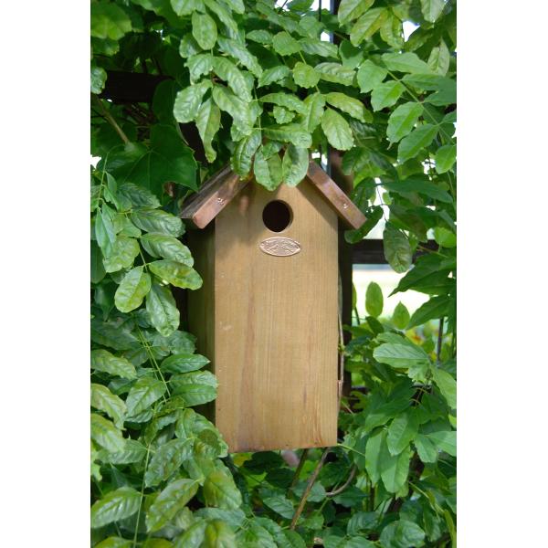 Joli nichoir avec une ouverture d'envol standard de 32 mm qui est prévu pour les mésanges, les moineaux et parfois le joli gobemouche. Ce nichoir traditionnel a un look rural et est équipé d'un toit en cuivre étanche.