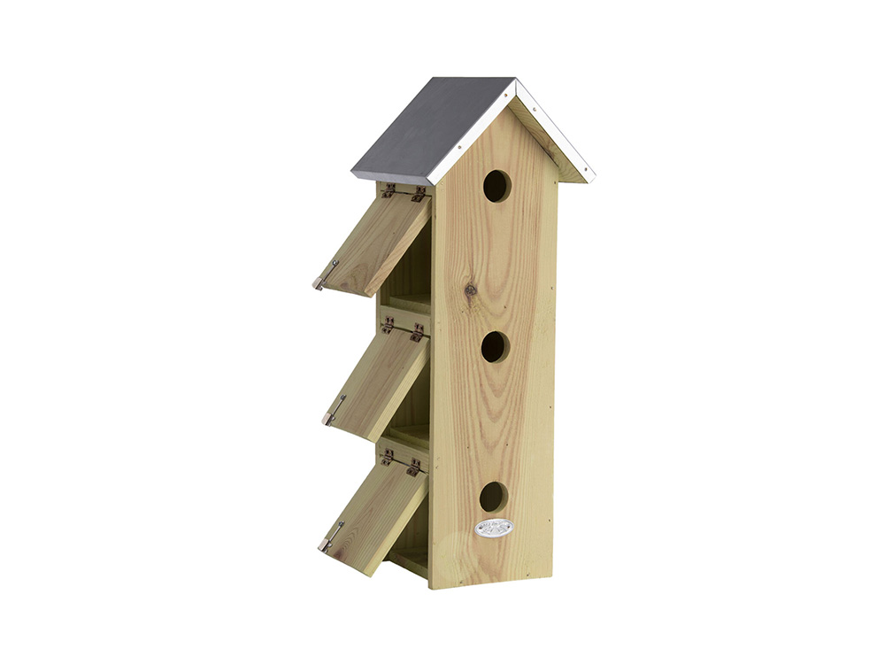 Un joli nichoir pour moineaux, avec 3 chambres superposées, pour trois familles de moineaux. Ce nid pour moineaux comprend 3 nichoirs séparés, car les moineaux sont des oiseaux coloniaux qui préfèrent nicher à proximité les uns des autres. Chaque chambre est équipée de sa propre ouverture d'entrée et d'une porte séparée pour permettre le nettoyage après la saison de reproduction.