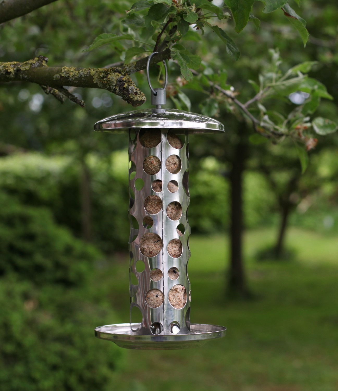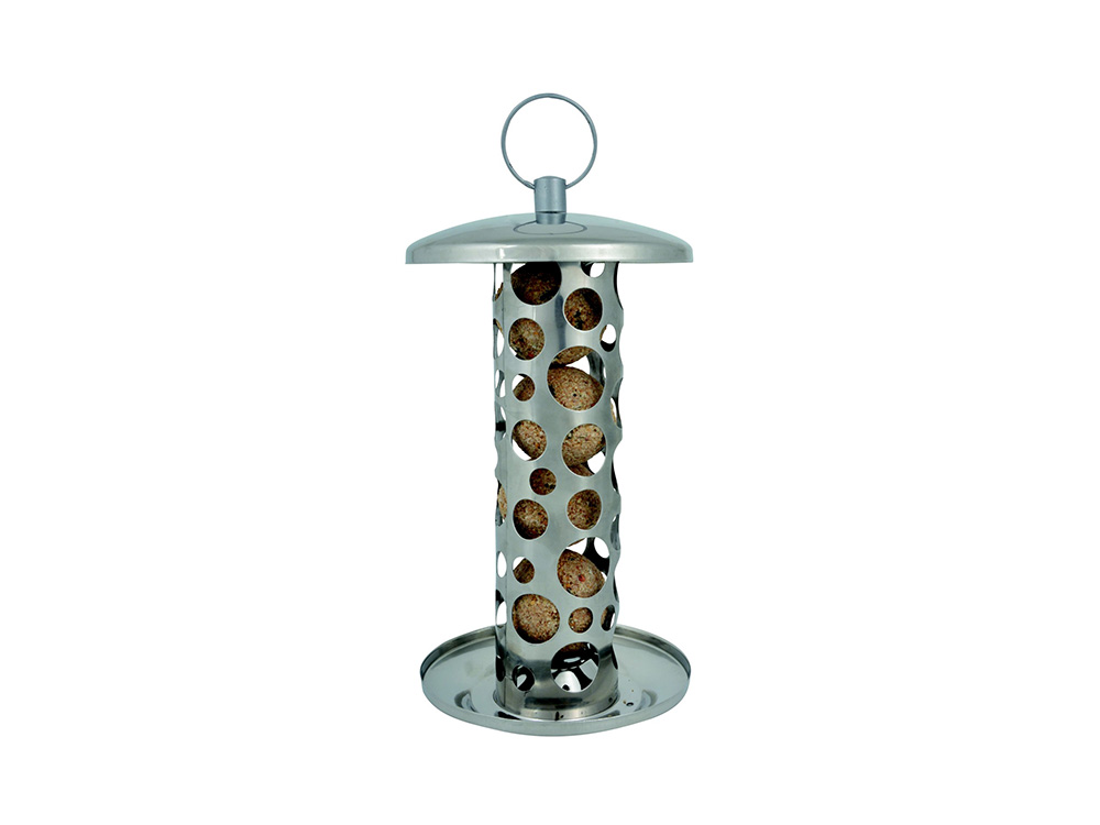 Joli distributeur de boules de graisse d'Esschert Design, moderne, présenté en acier inoxydable. Ce distributeur offre de la place pour 4 à 5 boules de graisse et est prévu pour l'usage de boules de graisse sans filet. Un distributeur de boules de graisse a comme avantage que les grands oiseaux comme les choucas et les pies ne peuvent s'emparer des boules entières.