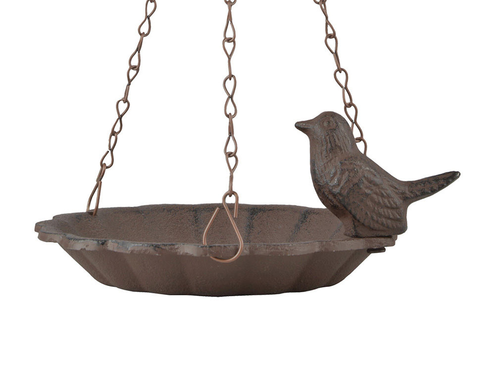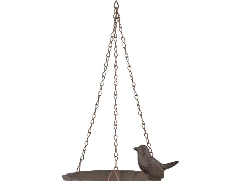Bain pour oiseau suspendu de Esschert design, en fonte et décoré d'un charmant petit oiseau posé sur le bord. Le bain d'oiseau est équipé de trois chaînettes et d'un crochet.