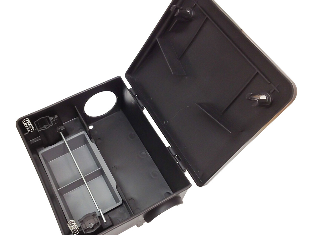 Avec la clé livrée, vous pouvez ouvrir la boîte. A l'intérieur, vous trouverez un petit plateau amovible pour y placer des grains ou de la pâte comme appât, ainsi qu'une petite tige en métal pour y installer des blocs de poison pour rats.