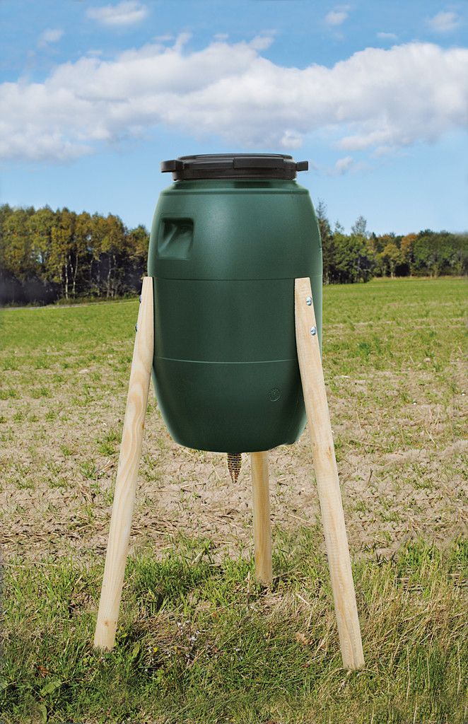 Le tonneau avec couvercle à vis est suspendu entre trois pieds en bois robustes qui sont fixés au tonneau à l'aide des boulons fournis.