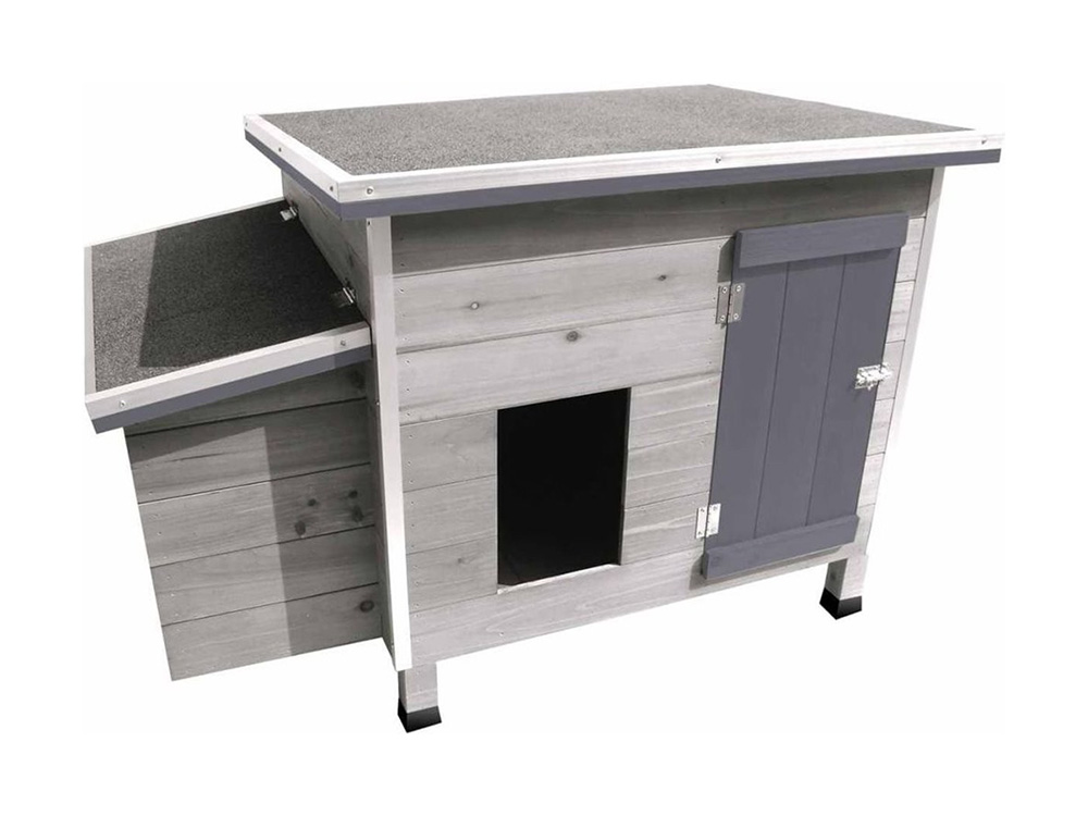 Poulailler compact avec poulailler de nuit, nid de nidification et 2 portes avec serrure coulissante. Ce poulailler en bois de pin est teinté en gris et convient à trois poulets. Les coins de cette claque et des avant-toits sont recouverts d’aluminium et les quatre pieds sont recouverts de caoutchouc pour une durée de vie plus longue.
