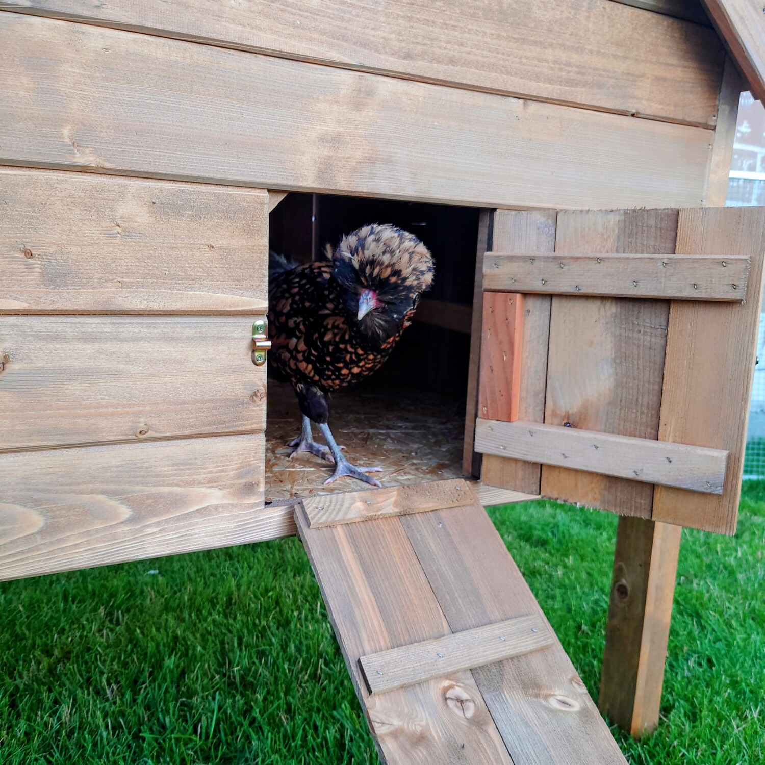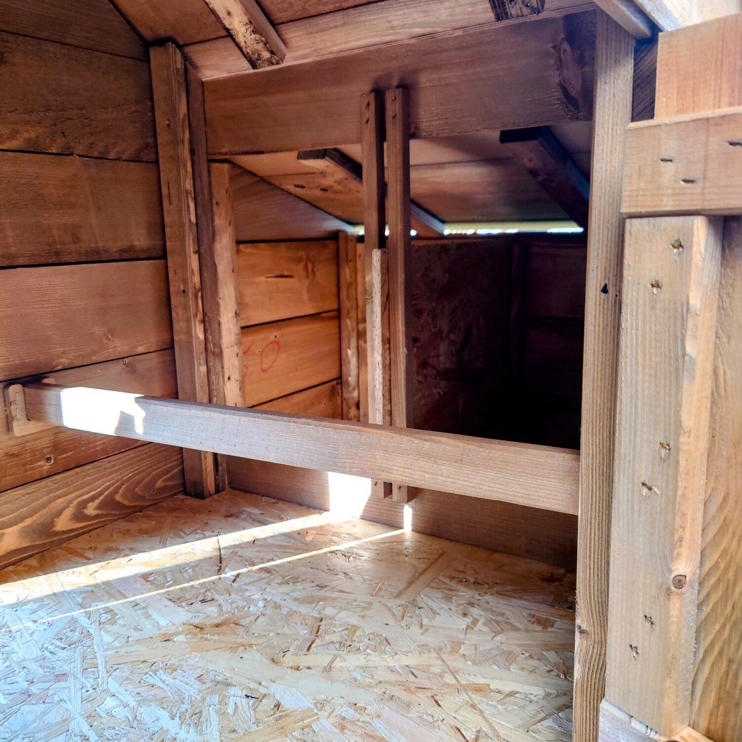 Ces poulaillers reposent sur de hautes pattes et disposent d’une longue passerelle pour le confort des poules. Le nid de pondeur est équipé de deux zones séparées et peut être monté à la fois sur le côté gauche et droit, selon vos préférences. Le fond du nid de ponde et celui du poulailler sont tous deux constitués de planches OSB en bois. De plus, deux perchoirs amovibles en bois sont disponibles, sur lesquels les poules peuvent se reposer confortablement.