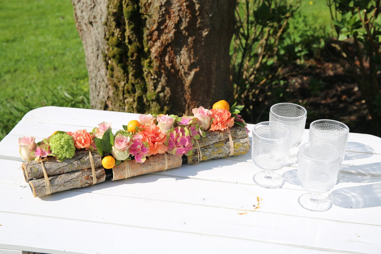 Laissez la mousse florale flotter sur l'eau à l'envers (ne pas immerger). La mousse absorbe l'eau jusqu'à ce qu'elle coule au fond. Retirez le bloc de l'eau et terminez avec des fleurs. Coupez la tige en biais à la bonne longueur et insérez-la dans la mousse. Finalisez avec du feuillage et des décorations.