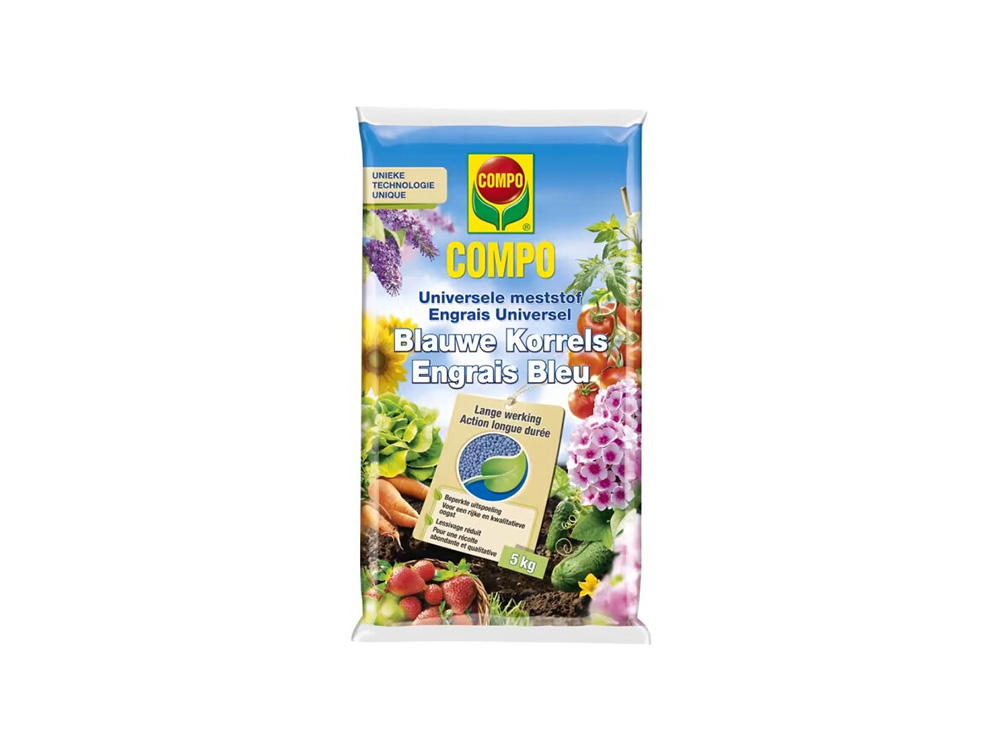 Cet engrais de haute qualité de Compo convient à fertiliser tout le potager et le jardin ornemental. Les granules bleus contiennent tous les nutriments et oligo-éléments nécessaires pour des plantes robustes et un rendement plus élevé dans le potager.