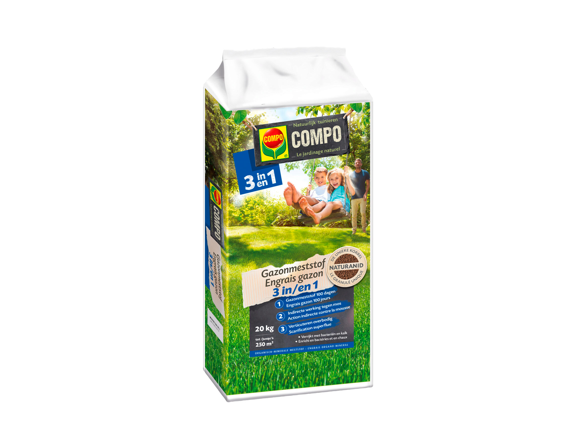COMPO Engrais Gazon 3 en 1 convient pour la fertilisation des pelouses d’agrément, de sport et de jeux présentant de la mousse et du feutre – y compris les pelouses tondues avec un robot tondeuse.