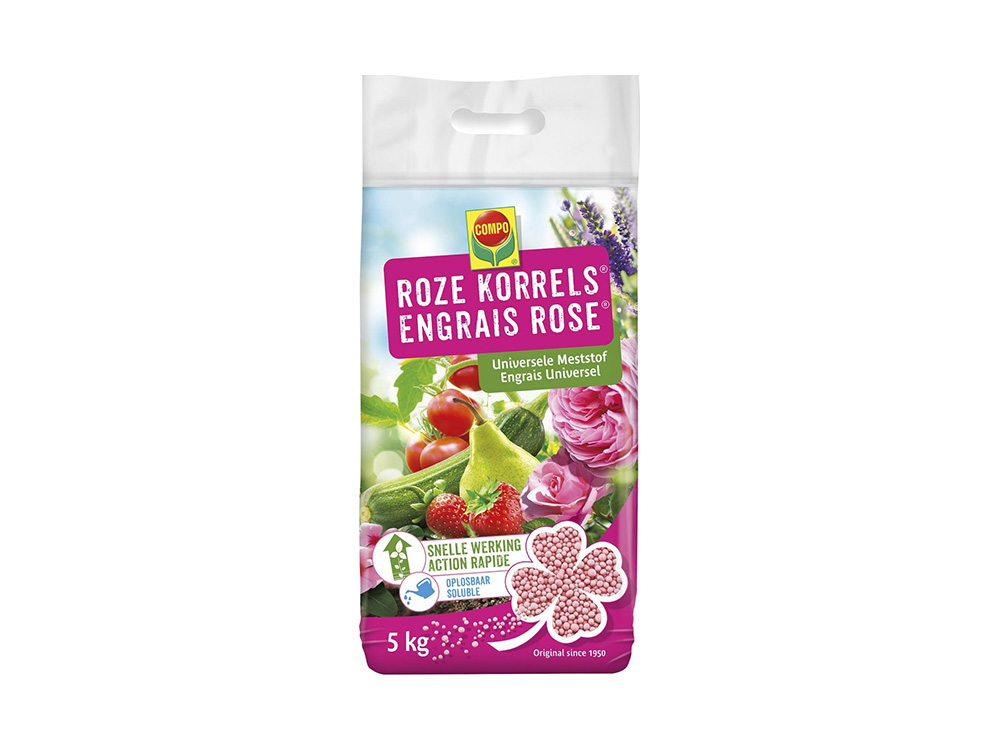 Granules roses de Compo avec une composition riche pour fertiliser tout le jardin : légumes, arbres fruitiers, plantes de lit, arbustes, plantes ornementales, conifères, haies...