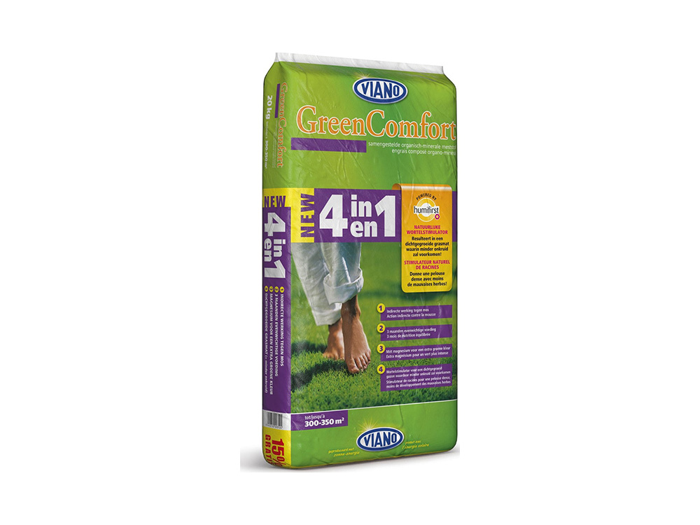 L'engrais pour gazon 4-en-1 GreenComfort de Viano est un engrais composé organo-minéral avec un stimulateur de racines unique, qui permet d'obtenir un gazon dense et moins de mauvaises herbes.