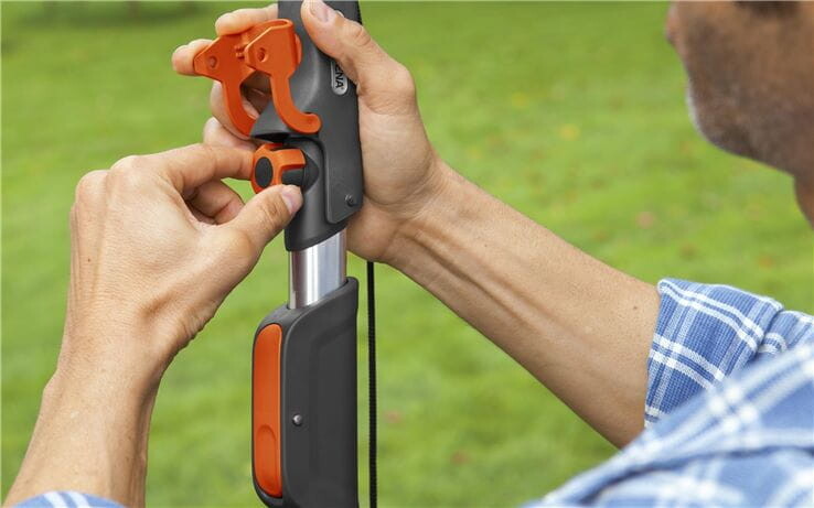 Le manche télescopique en aluminium est particulièrement léger et stable. Le manche a une forme ovale pour assurer plus de stabilité et pour éviter toute torsion durant le réglage. Un amortisseur évite aussi un repli inattendu pour éviter les blessures possibles. Le bouton de fixation permanent en plastique tendre garantit un raccordement résistant aux tractions et aux torsions entre le manche et l'outil.