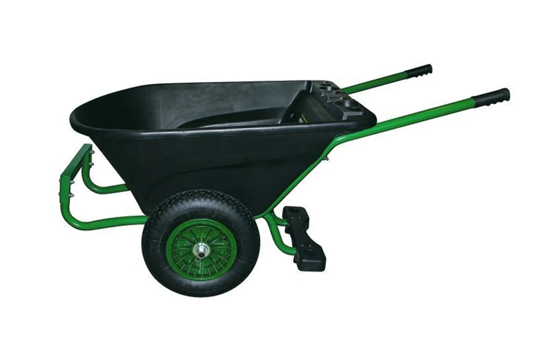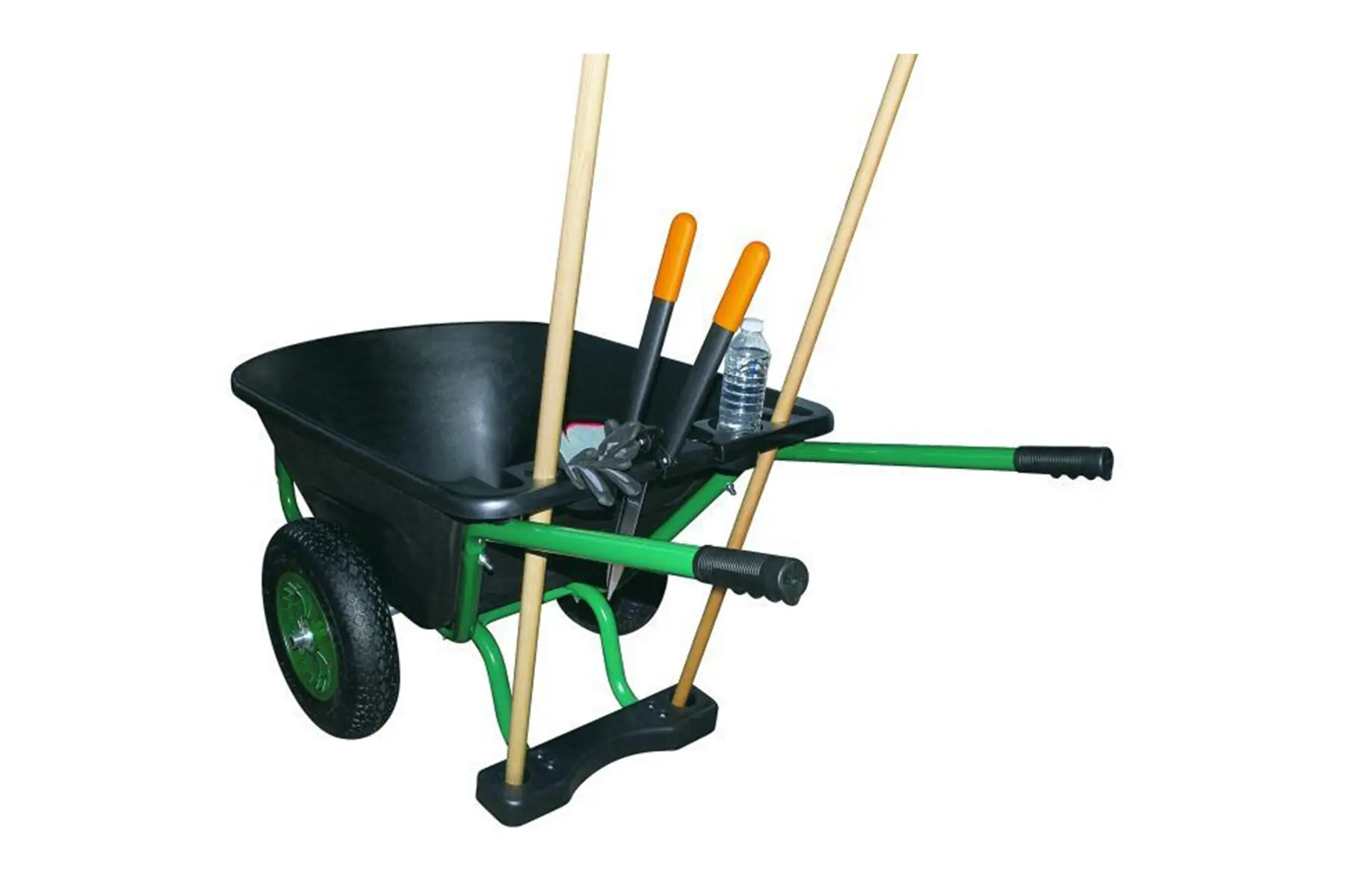 Brouette de jardin avec deux roues et un porte-outils. Cette brouette multifonctionnele d'une capacité de 125 litres est équipé d'une double base roulante, de poignées robustes et d'une couverture frontal pour protéger la brouette.