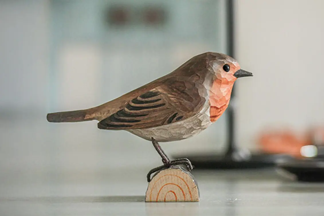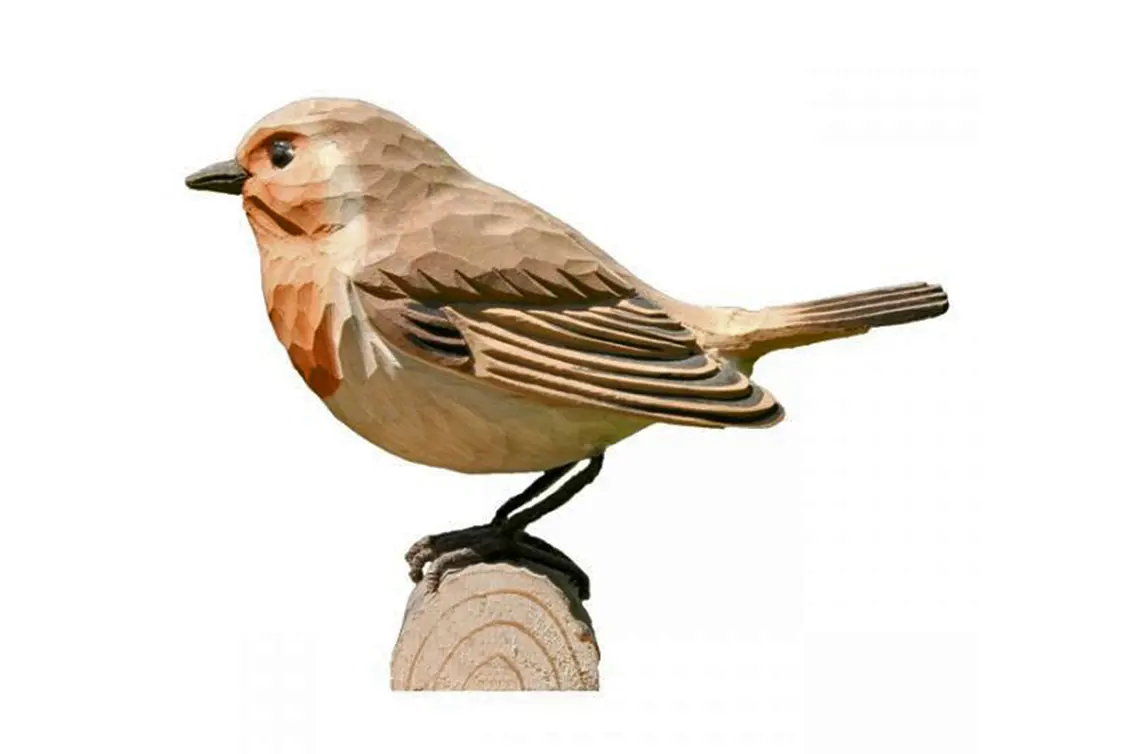 Rouge-gorge (Erithacus rubecula) en bois façonné de manière artisanale. Le rouge-gorge est reproduit grandeur nature et est décoré avec de la peinture écologique.