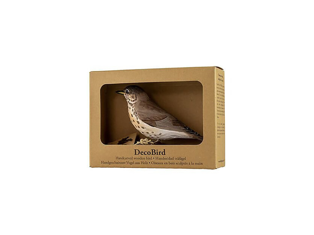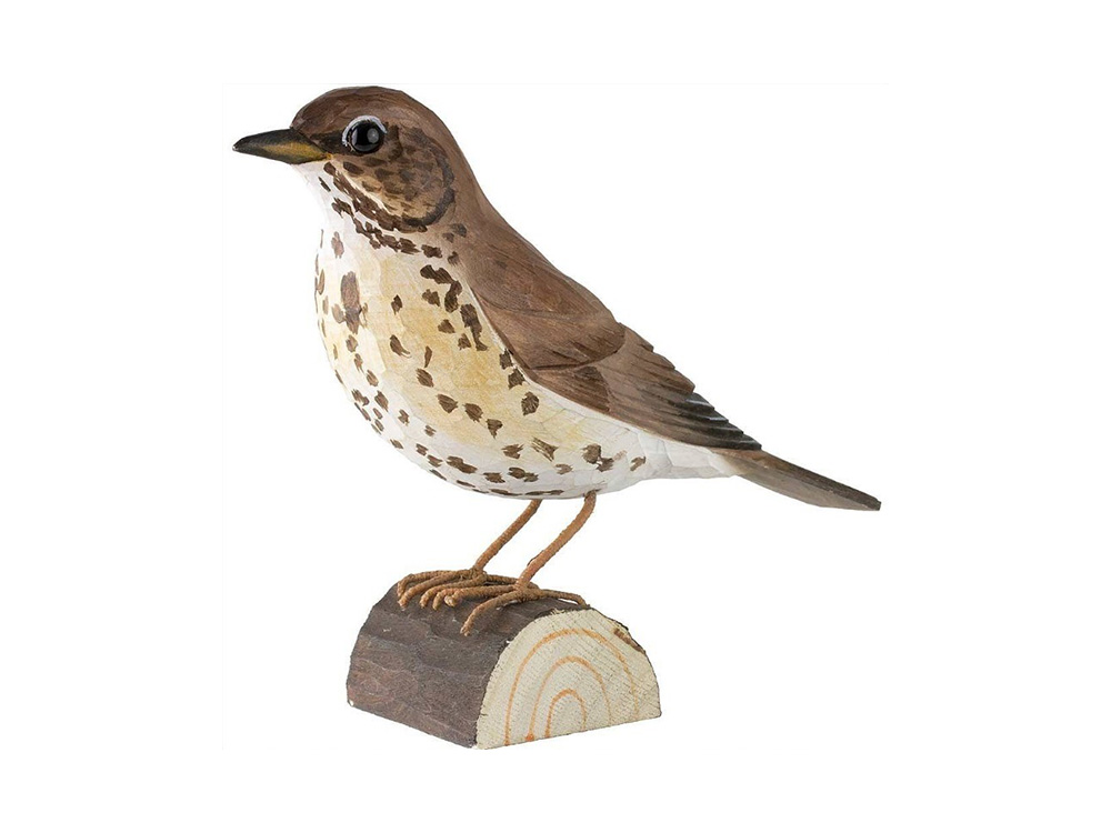 Grive chanteuse en bois traditionnelle. La grigue est exposée grandeur nature et peinte avec une peinture écologique.