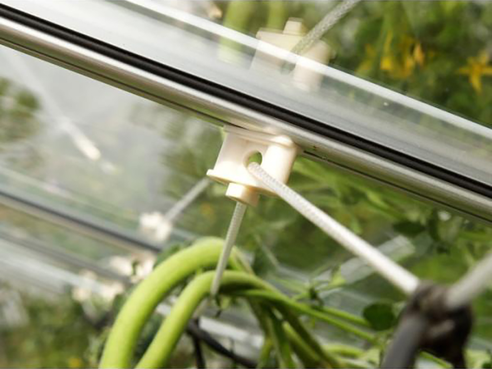 Grâce à la tête de boulon inclinable, le crochet s’insère dans la fente du profil de serre ou de serre et convient à différentes applications. Par exemple, vous pouvez facilement fixer le fil de soutien pour guider les tomates et autres plantes.