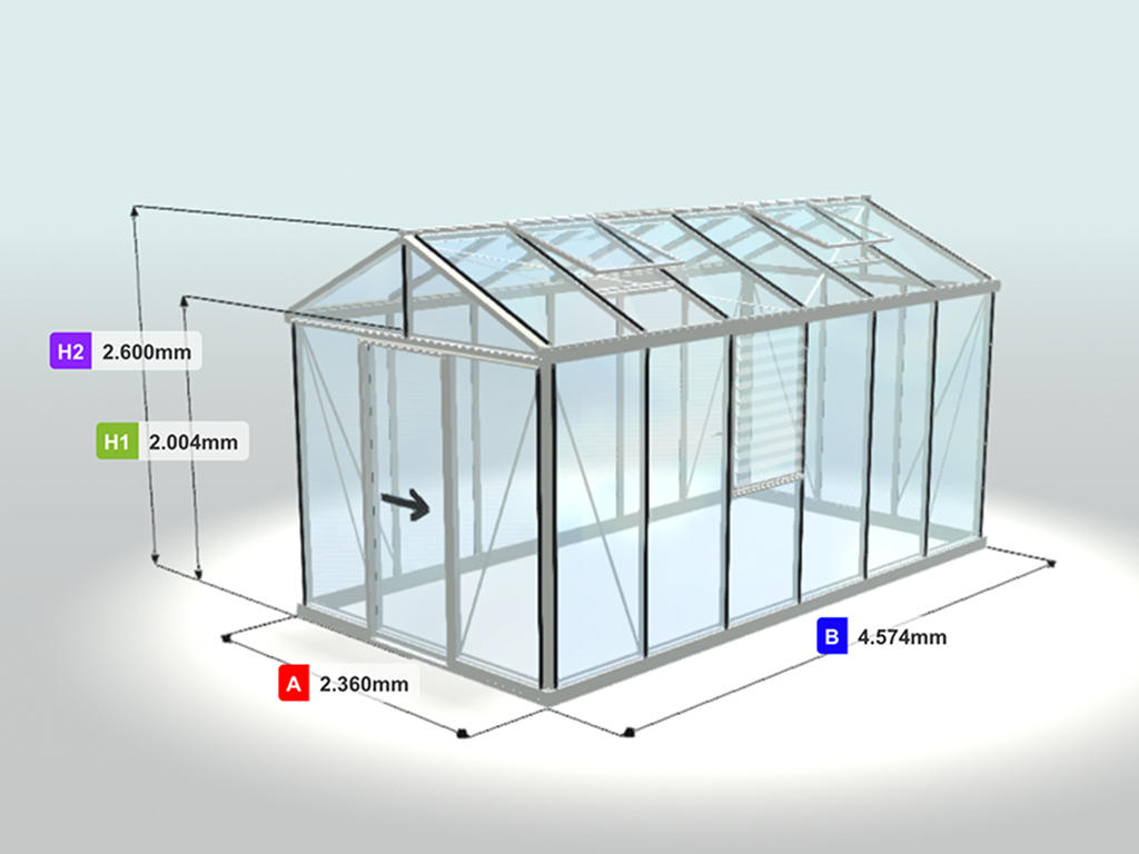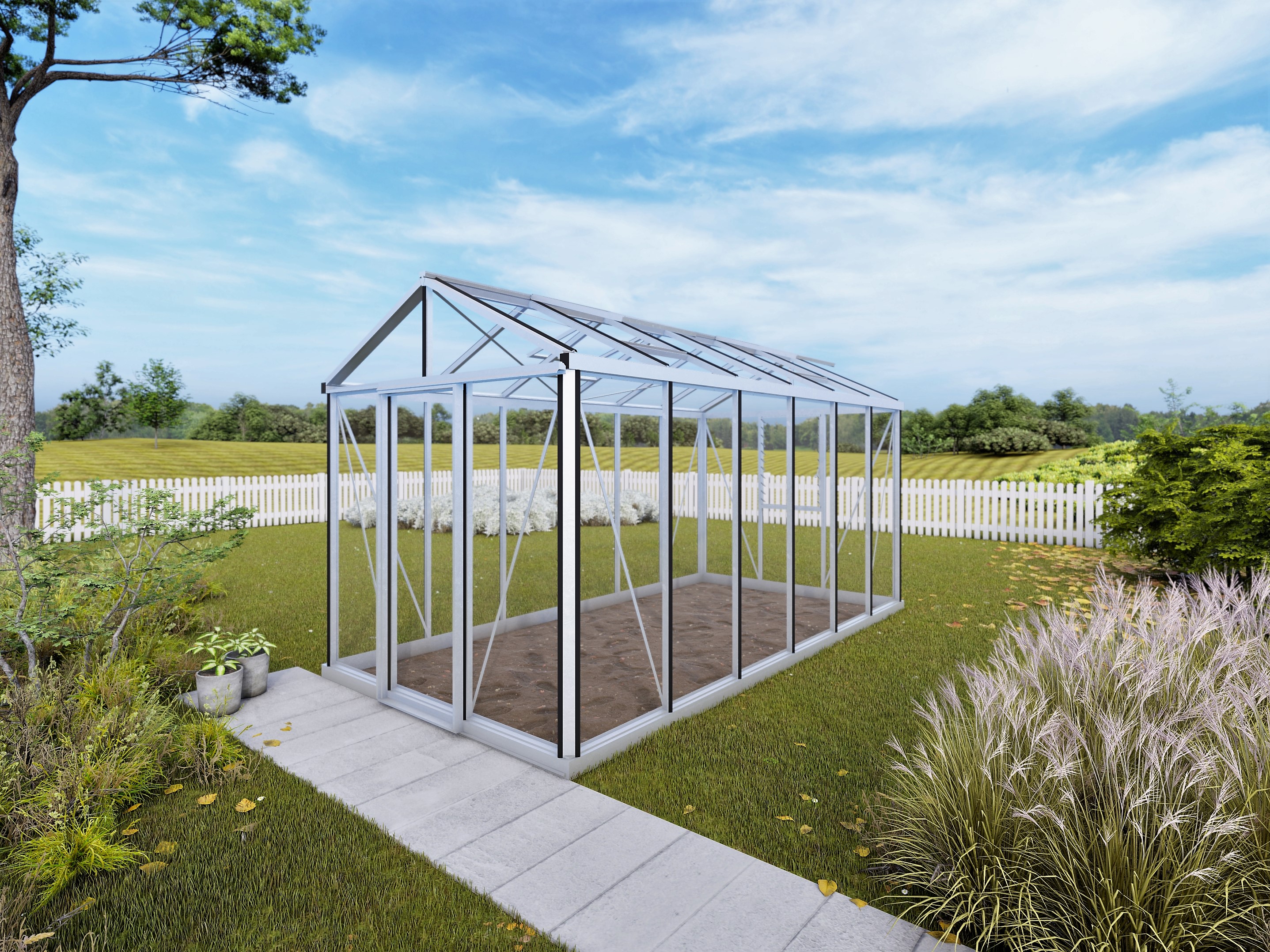 La hauteur de gouttière unique de 201 cm vous permet de vous tenir debout partout dans cette Helios Master spacieuse. La hauteur de faîtage est de 260, 274 ou 278 cm, selon la taille de la serre. Toutes les serres Janssens sont équipées d'un verre de sécurité de 4 mm, d'un profilé de gouttière avec évacuation de l'eau (40 mm) jusqu'au niveau du sol et d'un profilé de fondation intégré et solide qui peut être ancré. La Helios Master est équipée d'au moins une porte coulissante, de deux lucarnes et d'une fenêtre latérale à lamelles.