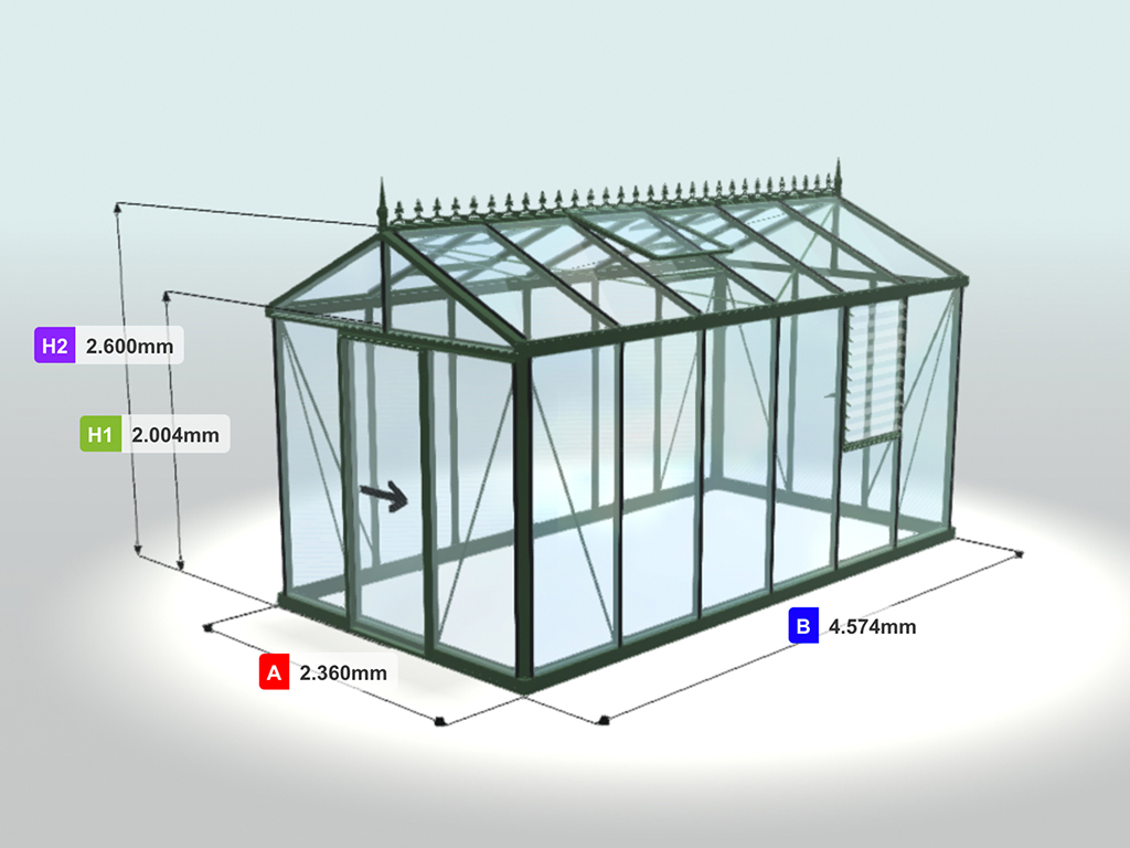 Cette serre Helios Master haut de gamme (hauteur de faîtage 260 cm) est équipée en standard d'une double porte coulissante, de 3 lucarnes et d'une fenêtre à lamelles. Le rapport largeur-profondeur de cette serre est de 3 x 6 vitres.