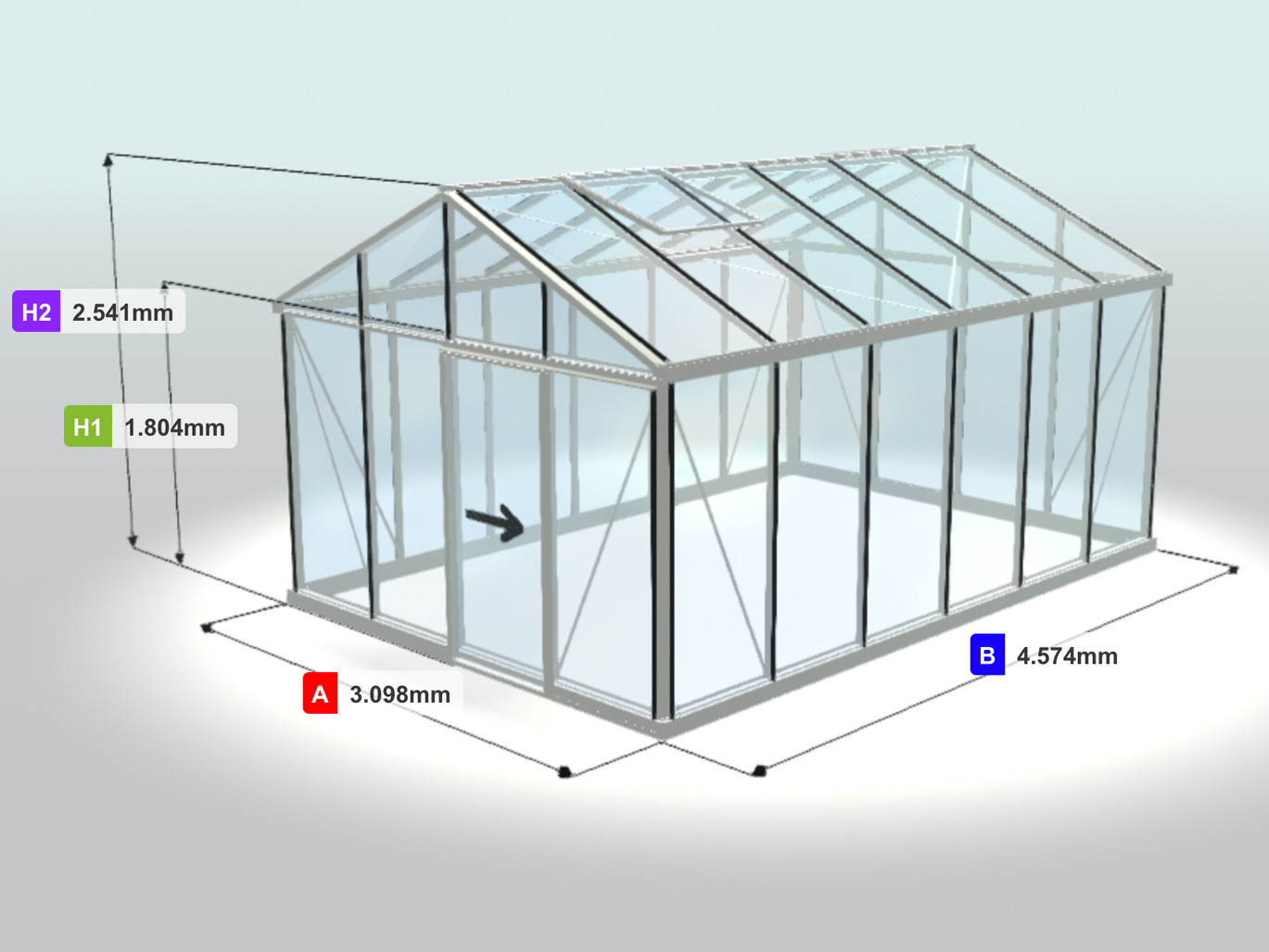 Ce modèle mesure 310 x 458 cm, ce qui vous offre une surface de travail de près de 14,2 m². Le rapport largeur-profondeur de 4 x 6 vitres permet une disposition spacieuse et pratique.