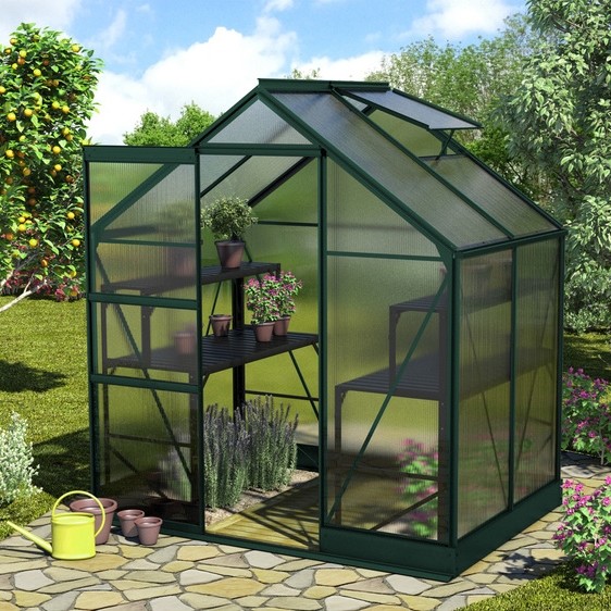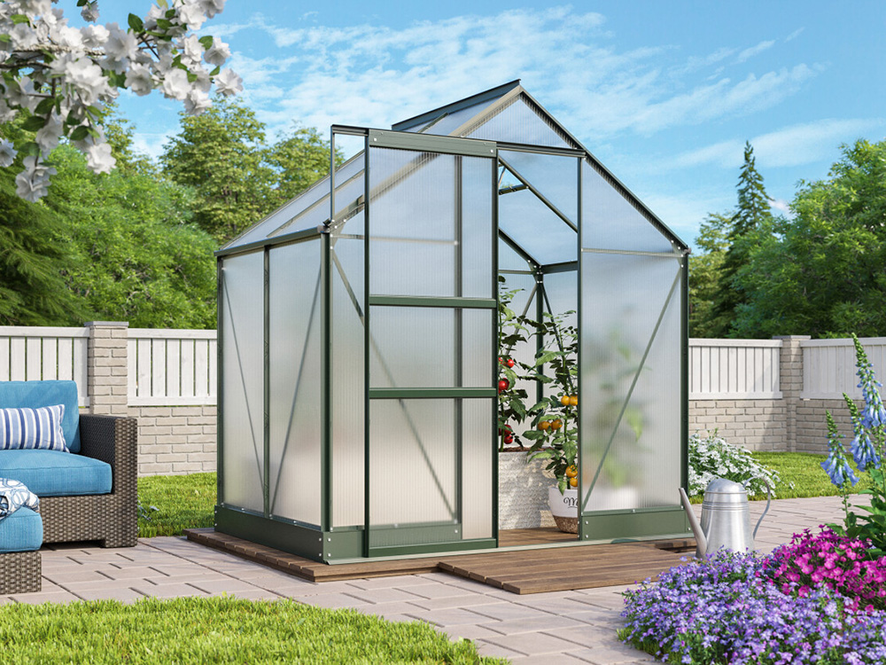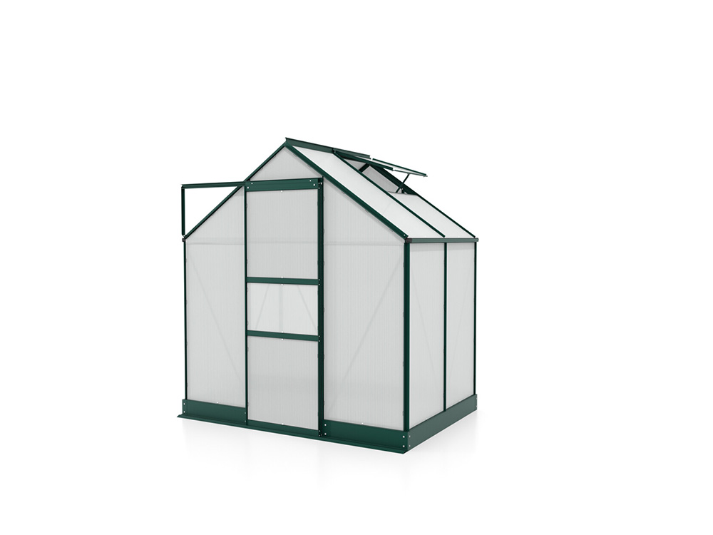 Le cadre est composé de profils en aluminium verd revêtu en poudre. La porte coulissante de 61 cm de large peut être suspendue de manière à s’ouvrir à gauche ou à droite. La serre est également équipée de gouttières intégrées et de fondations dans la structure de la serre. La fondation assure une connexion solide et optimale entre le cadre et la fondation.