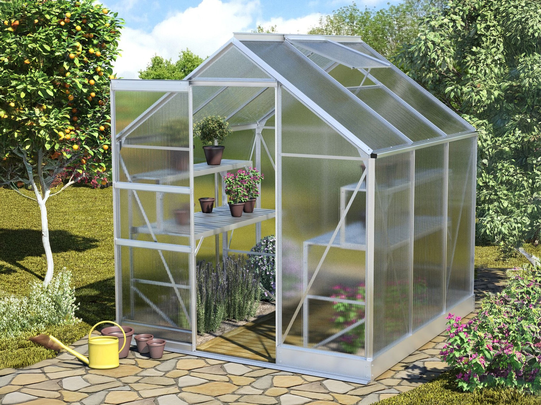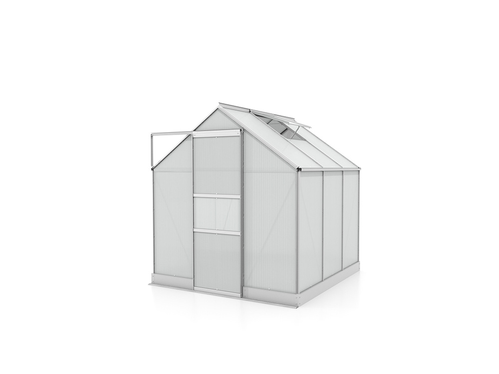 Le cadre est fabriqué en aluminium anodisé durable afin que la serre ait l’air neuve pour les années à venir. La serre est fournie de série avec des feuilles de polycarbonate de 4 mm. Ces panneaux à double paroi sont légers, presque incassables et offrent une excellente isolation ! En option, vous pouvez opter pour du polycarbonate de 6 mm.