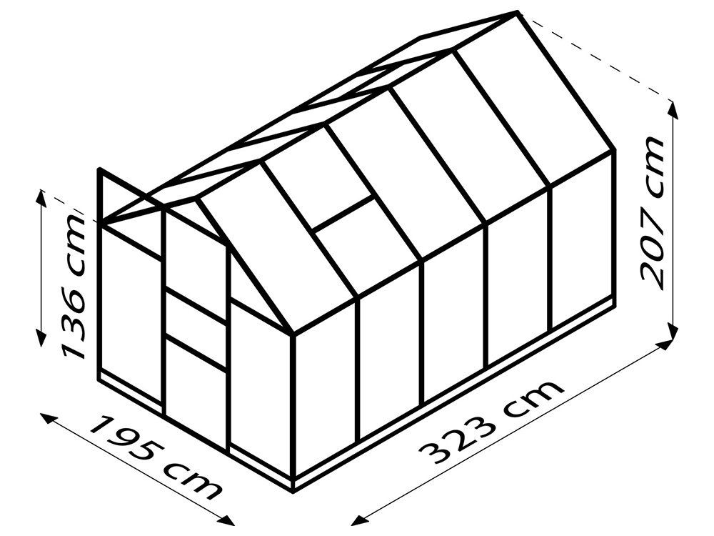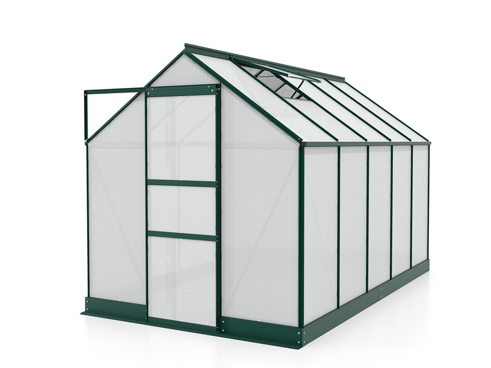 Le cadre est composé de profils en aluminium verd revêtu en poudre. La porte coulissante de 61 cm de large peut être suspendue de manière à s’ouvrir à gauche ou à droite. La serre est également équipée de gouttières intégrées et de fondations dans la structure de la serre. La fondation assure une connexion solide et optimale entre le cadre et la fondation.