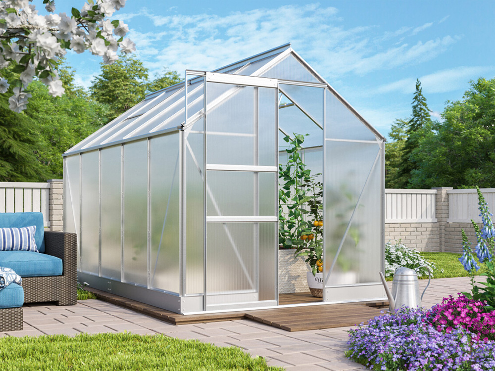 Le cadre est fabriqué en aluminium anodisé durable afin que la serre ait l’air neuve pour les années à venir. La serre est fournie de série avec des feuilles de polycarbonate de 4 mm. Ces panneaux à double paroi sont légers, presque incassables et offrent une excellente isolation ! En option, vous pouvez opter pour du polycarbonate de 6 mm.
