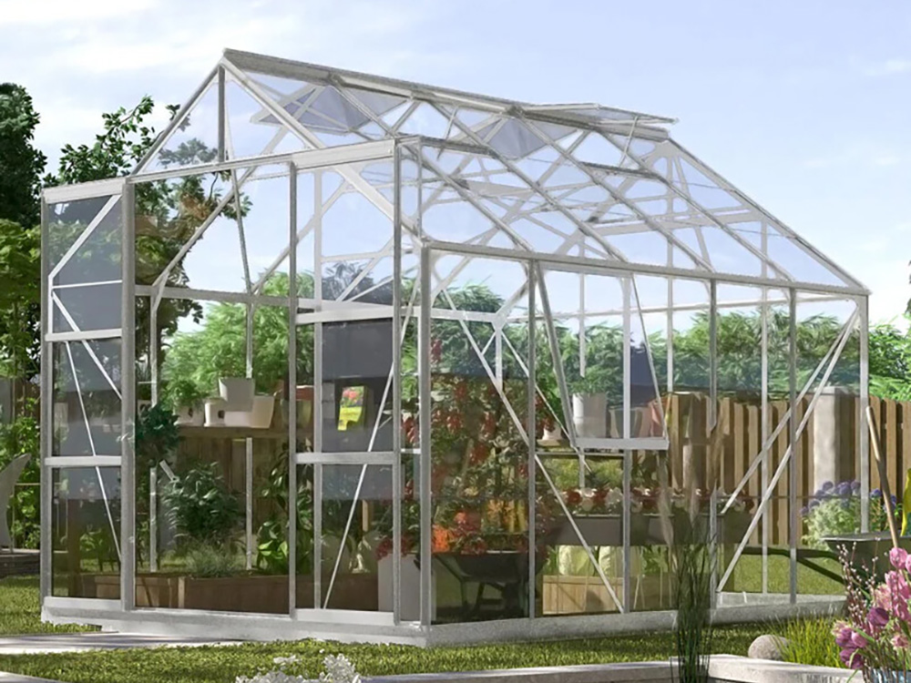 Jupiter a une hauteur impressionnante de 248 cm et une largeur de 257 cm. Une hauteur de bord de toit de 154 cm offre plus d’espace pour la tête et d’espace de travail. Une résistance supplémentaire est obtenue grâce à des plaques d’angle et des renforts dans toute la serre, afin que vous puissiez exercer plus de tension sans souci.