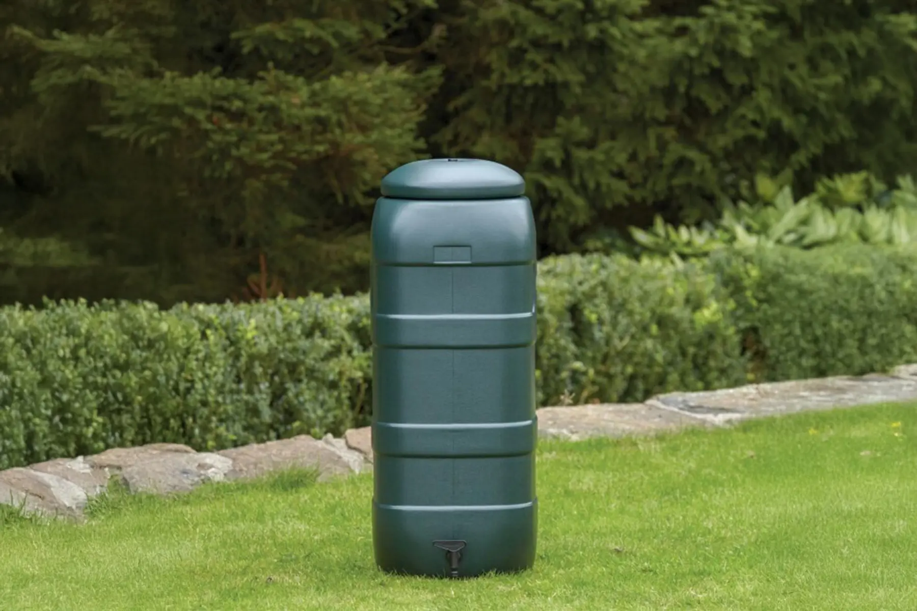 Le tonneau proposé en vert foncé est réalisé en plastique durable et passera complètement inaperçu au jardin.
