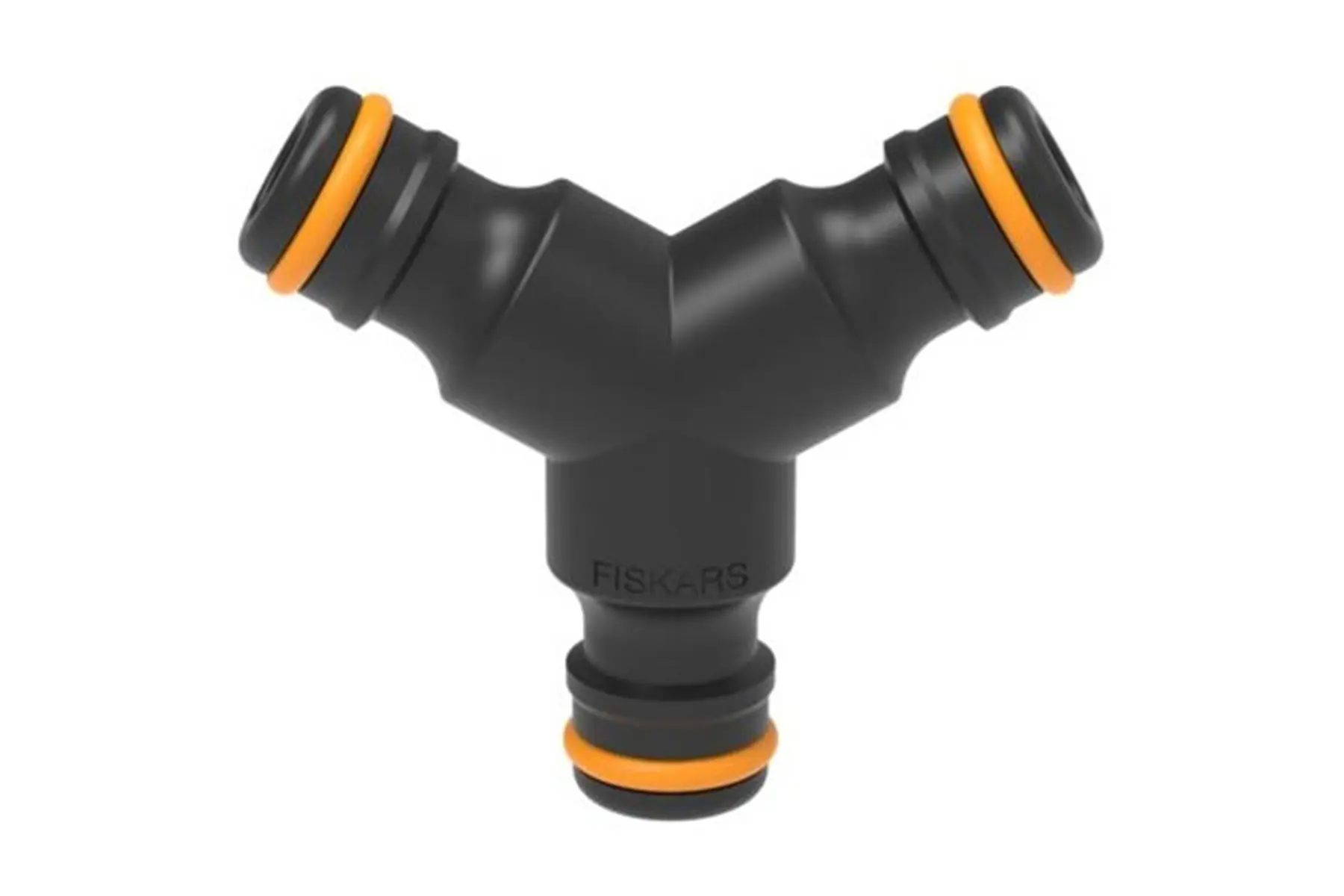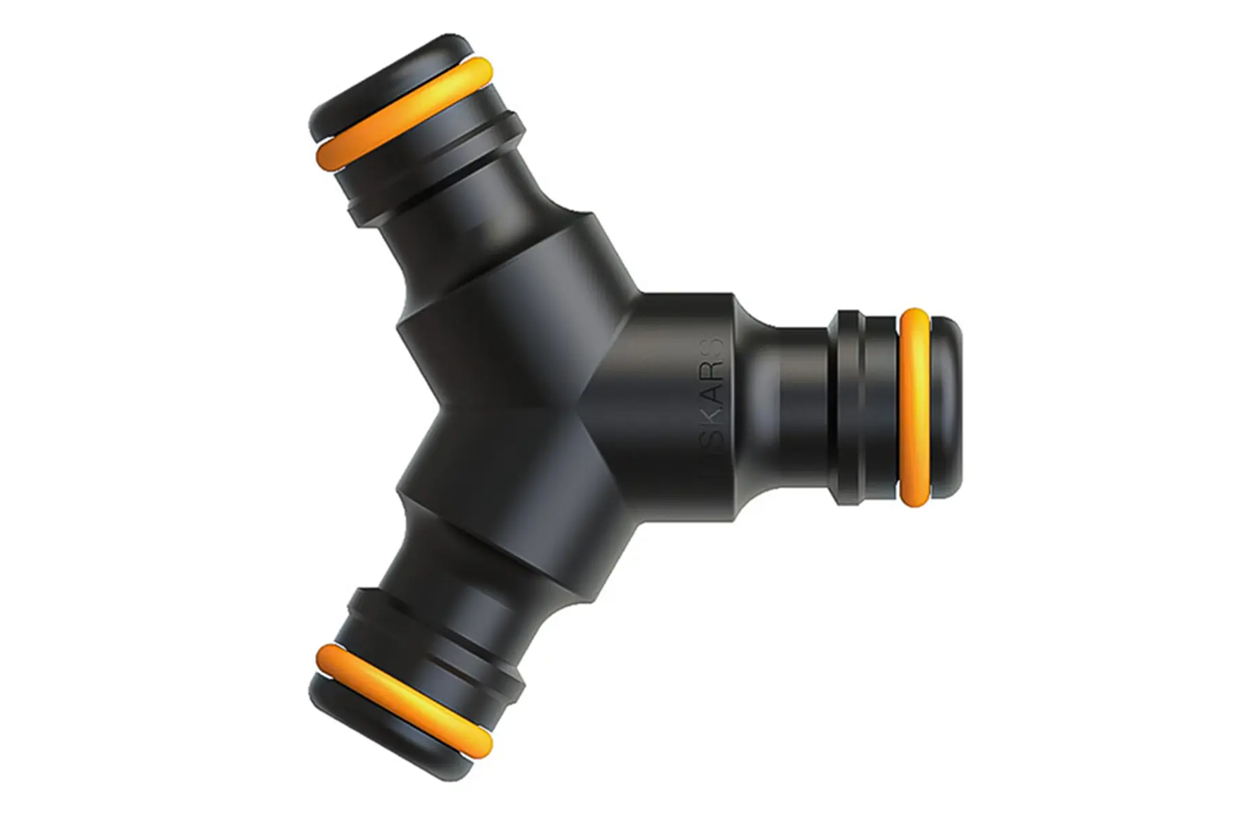 Pour connecter une source d'eau à deux tuyaux de jardin ou tuyaux de goutte à goutte de tailles variées, vous pouvez utiliser ce raccord 3 voies de Fiskars.