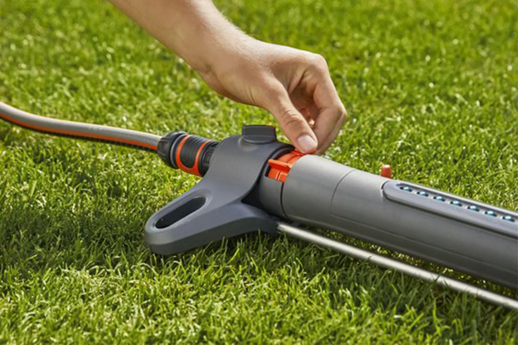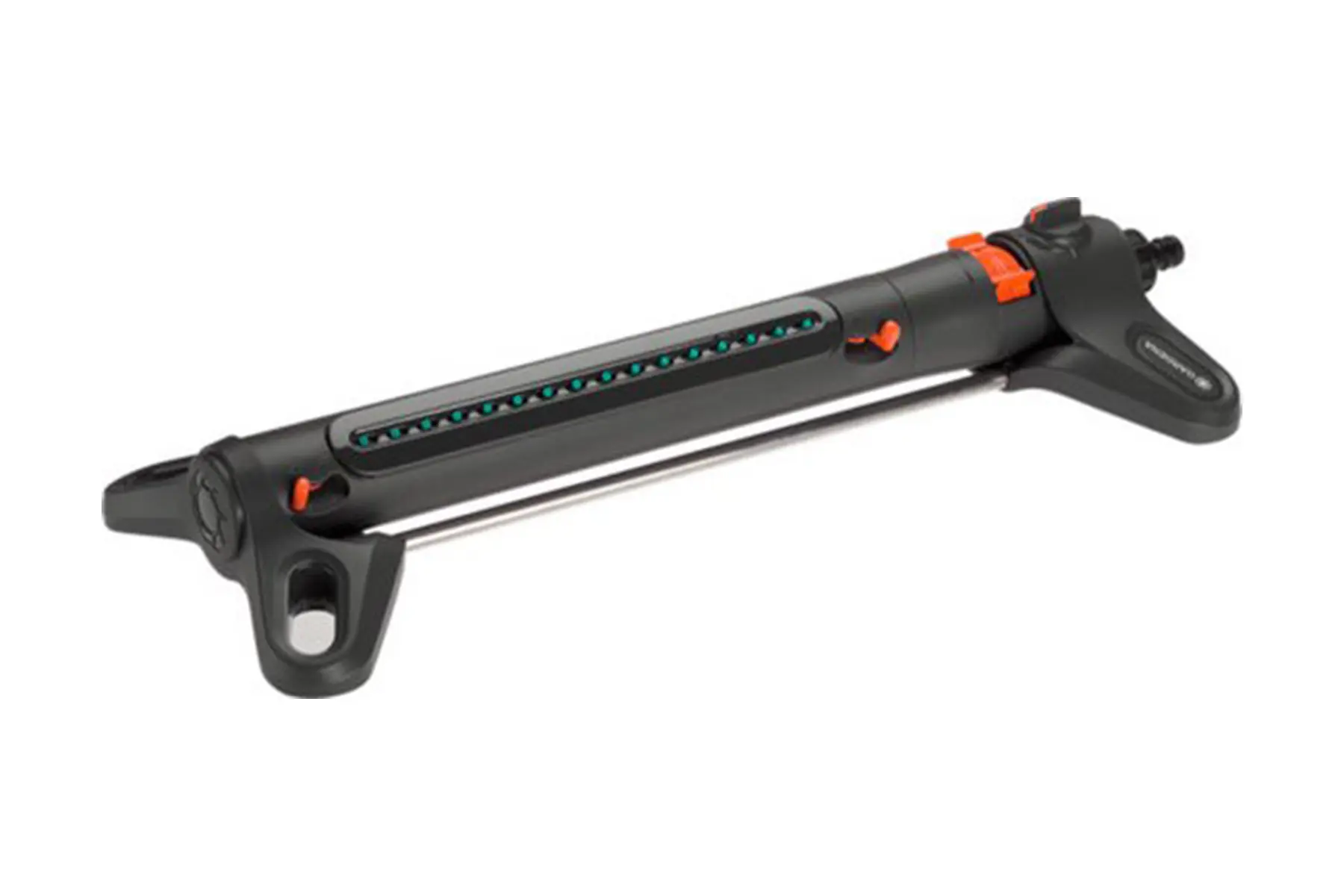 Utilisez les curseurs pour régler la portée (3-18 mètres), la largeur de pulvérisation (3-14 mètres) et le débit d'eau. Avec l'Aquazoom, vous pouvez déterminer exactement où l'eau tombe. Il est également possible de n'arroser que d'un côté. Les deux glissières extra-larges assurent la bonne tenue de l'arroseur.