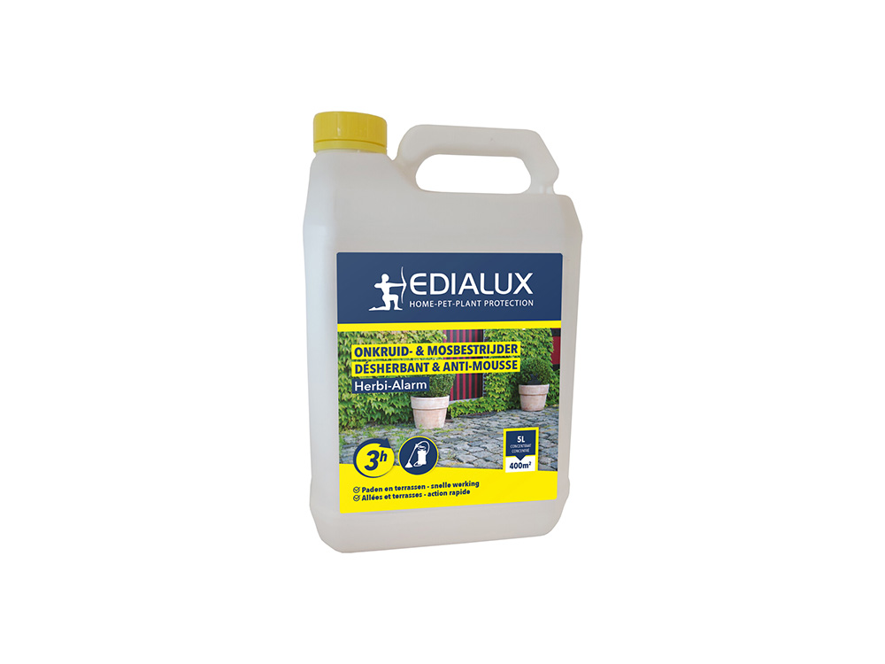 Herbi-alarm allées et terrasses est un désherbant total et non sélectif pour le contrôle des mauvaises herbes, graminées et mousses des zones pavées et incultes en permanence telles que les allées, les sentiers et les terrasses (asphalte, béton, pavés et graviers). Il peut également être utilisé entre les rangs de toutes cultures avec un capuchon de protection sur l'arroseur et pour semer ou planter des graminées et légumes ornementaux.