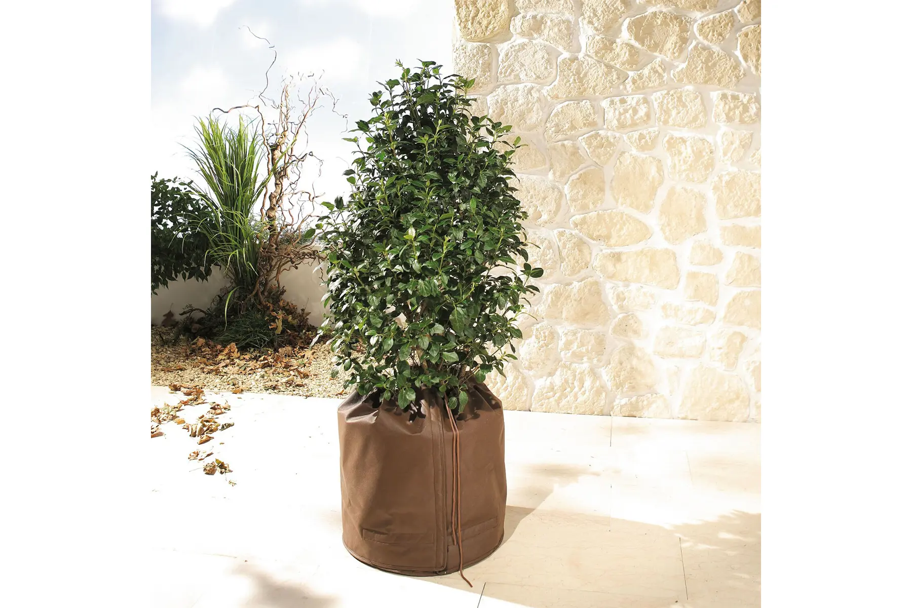 Facile et rapide à utiliser, elle se fixe à l'aide de bandes Velcro et se serre autour du pied de la plante grâce à un cordon pratique. Au bas de la housse se trouve une plaque d'isolation en polystyrène de 4 cm d'épaisseur avec des trous de drainage. L'intérieur de la housse est doublé de papier bulle pour une isolation supplémentaire.