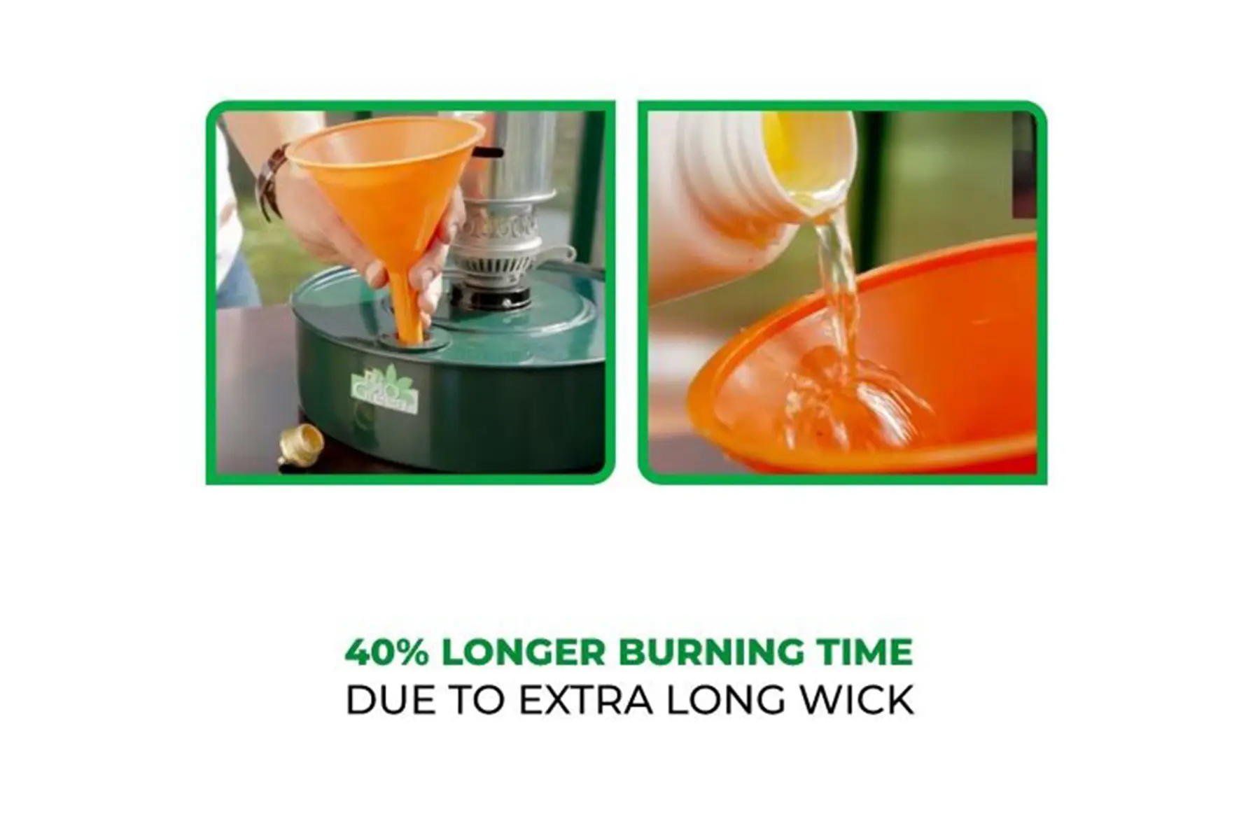 Grâce aux deux longues mèches, ce brûleur a une durée de combustion de 40% plus longue. Le brûleur est livré avec le matériel d'installation pour bien ancrer le système au sol, de façon sûre. Le brûleur est robuste et durable.