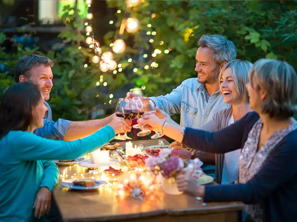 Le soir, nous rendons l'endroit encore plus accueillant avec de belles lumières. Les torches sont une alternative atmosphérique aux guirlandes que l'on voit souvent de nos jours. Enfin, créez vos propres cocktails délicieux, servez-les dans des verres joyeux et n'oubliez pas les amuse-bouches. 😉