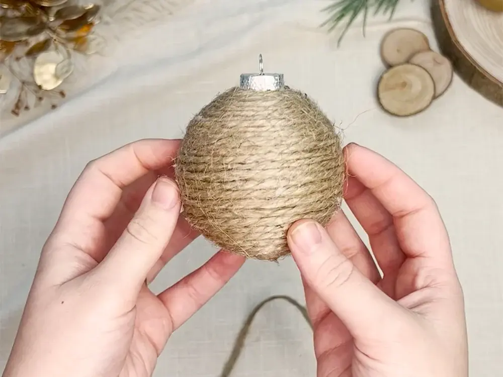 Pour la première option amusante, nous allons suivre la voie naturelle. À l'aide de votre pistolet à colle, fixez la corde de jute au sommet de la boule de Noël avec un peu de colle. Après cela, enroulez la corde autour de la boule. Veillez à ce qu'elle s'adapte bien à la boule de façon à ce qu'elle soit entièrement recouverte.