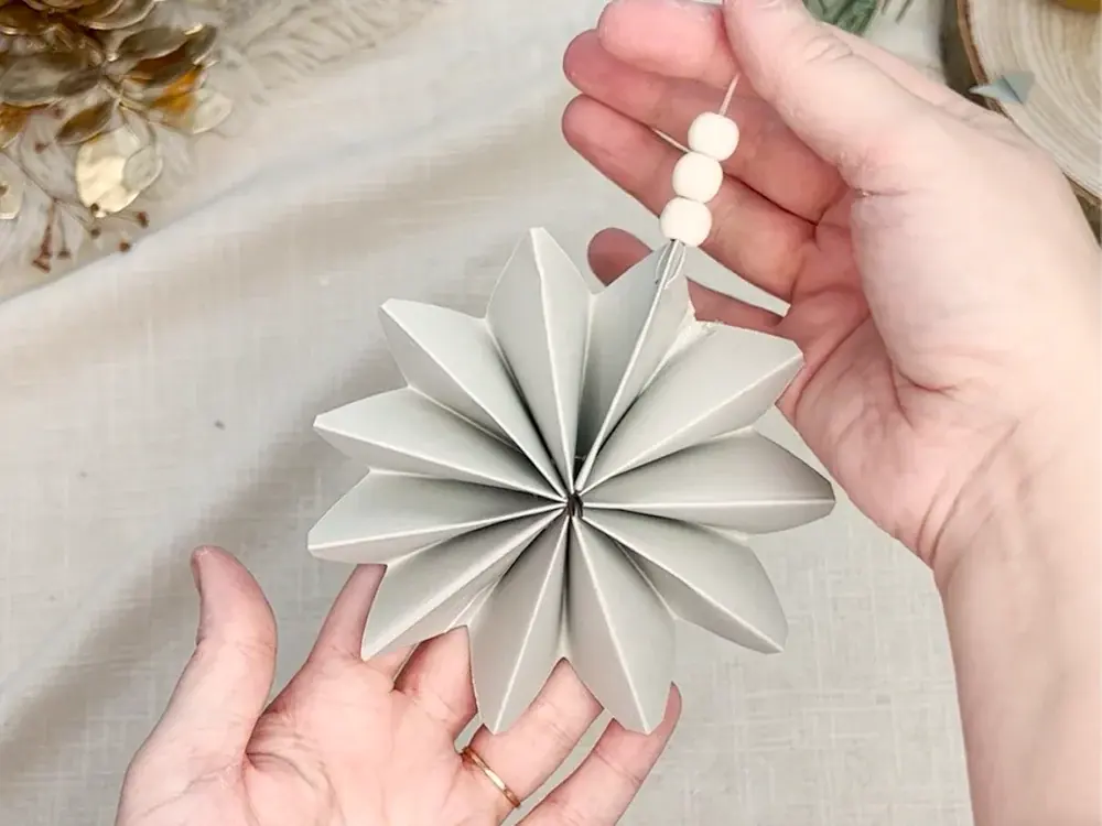 Prenez votre aiguille et faites un petit trou sur un côté du cercle de papier. De l'autre côté, coupez les coins des plis en un triangle. Enfilez maintenant le fil de nylon dans les trous précédemment réalisés. Serrez bien pour que l'étoile se forme et faites un nœud. Veux-tu accrocher l'étoile au sapin ? Faites alors un trou supplémentaire dans l'une des pointes. Voulez-vous que le fil de nylon soit un peu plus joli ? Ajoutez alors quelques perles en bois .