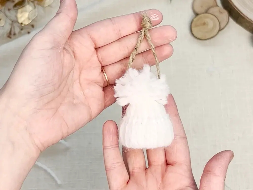Pour faire votre guirlande, ou pour suspendre le bonnet dans l'arbre, enfilez un autre morceau de ficelle dans les fils du bonnet.