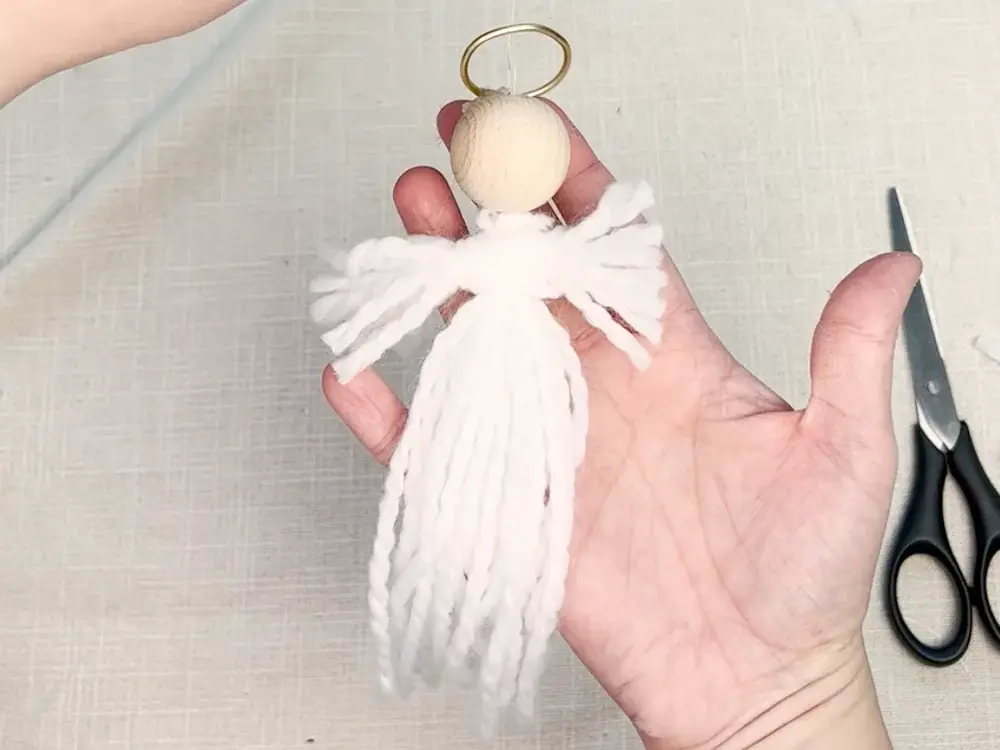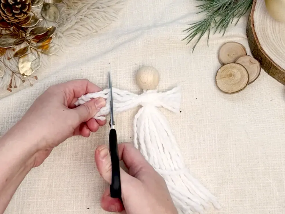 Nous commençons par la laine et coupons plusieurs morceaux d'environ 30 cm de long. Pliez les morceaux de laine en deux et attachez-les au milieu. Ce sera le corps de notre ange. À l'aide d'un morceau de fil de nylon, attachez la grande perle en bois sur le dessus du nœud précédent. Pour éviter que la perle ne bouge tout le temps, vous pouvez repasser le fil.