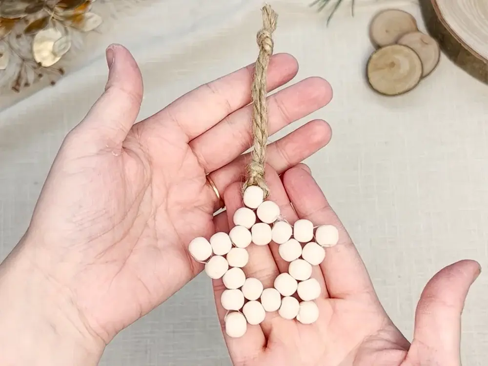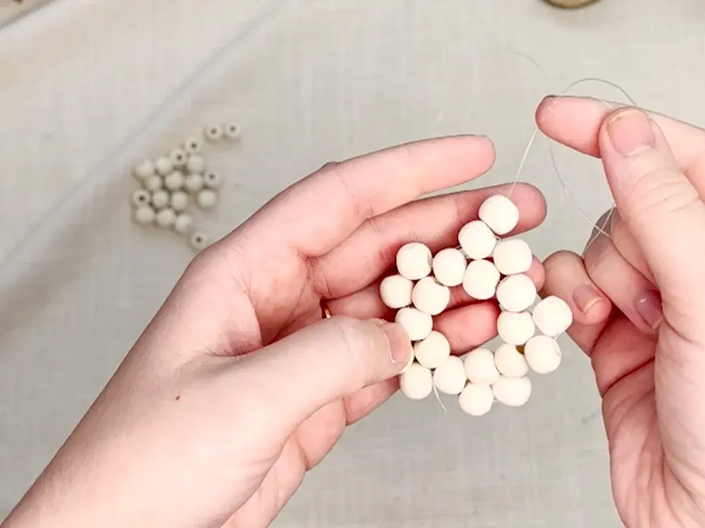 Pour ce faire, prenez à nouveau le fil de nylon, tirez-le à travers la première perle du deuxième rang et ajoutez une perle. Ramenez le fil vers le bas et enfilez-le dans la deuxième perle du deuxième rang. Répétez cette étape encore cinq fois. Attachez les extrémités ensemble et votre étoile en bois est terminée!