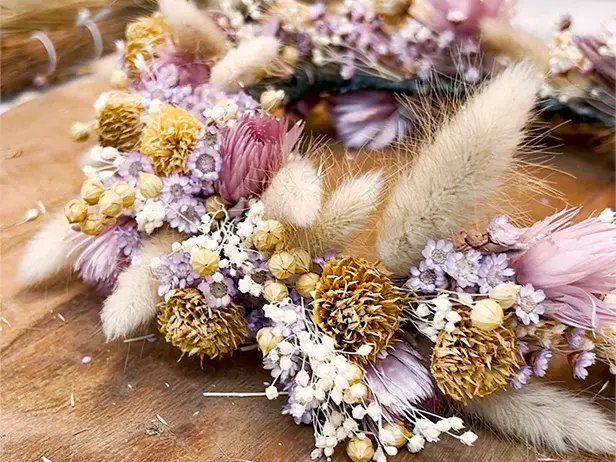 Dans cette dernière étape, vous allez littéralement mettre la couronne dans les fleurs. Vous allez coller les tiges des bouquets à la couronne à l'aide de ruban adhésif pour fleurs. Veillez à ce que les fleurs recouvrent toujours les tiges du bouquet précédent, de sorte que vous obteniez une couronne de fleurs séchées magnifiquement pleine.