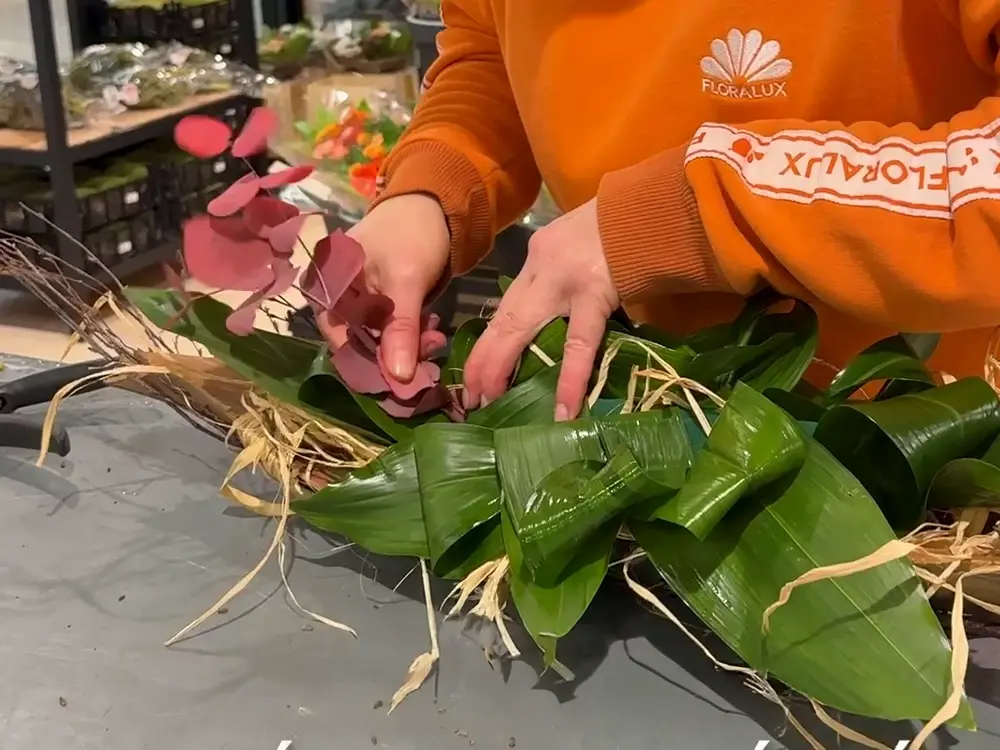 Enfin, prenez les feuilles d’aspidistra. Pliez chaque feuille en deux et passez la tige à travers pour former une boucle. Piquez la tige dans la mousse florale. Répétez pour toutes les feuilles.