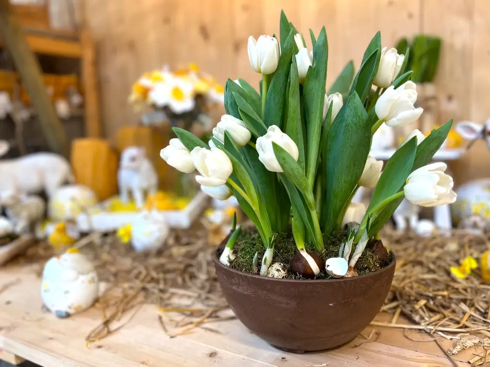 Dans notre rayon de plantes de jardin, nous choisissons quelques bulbes qui ont déjà commencé à pousser. Nous choisissons ici des tulipes et des crocus. Placez les bulbes dans les espaces entre la mousse florale et le pot à fleurs. Remplissez ensuite le reste du pot avec du terreau pour que les bulbes puissent bien pousser.